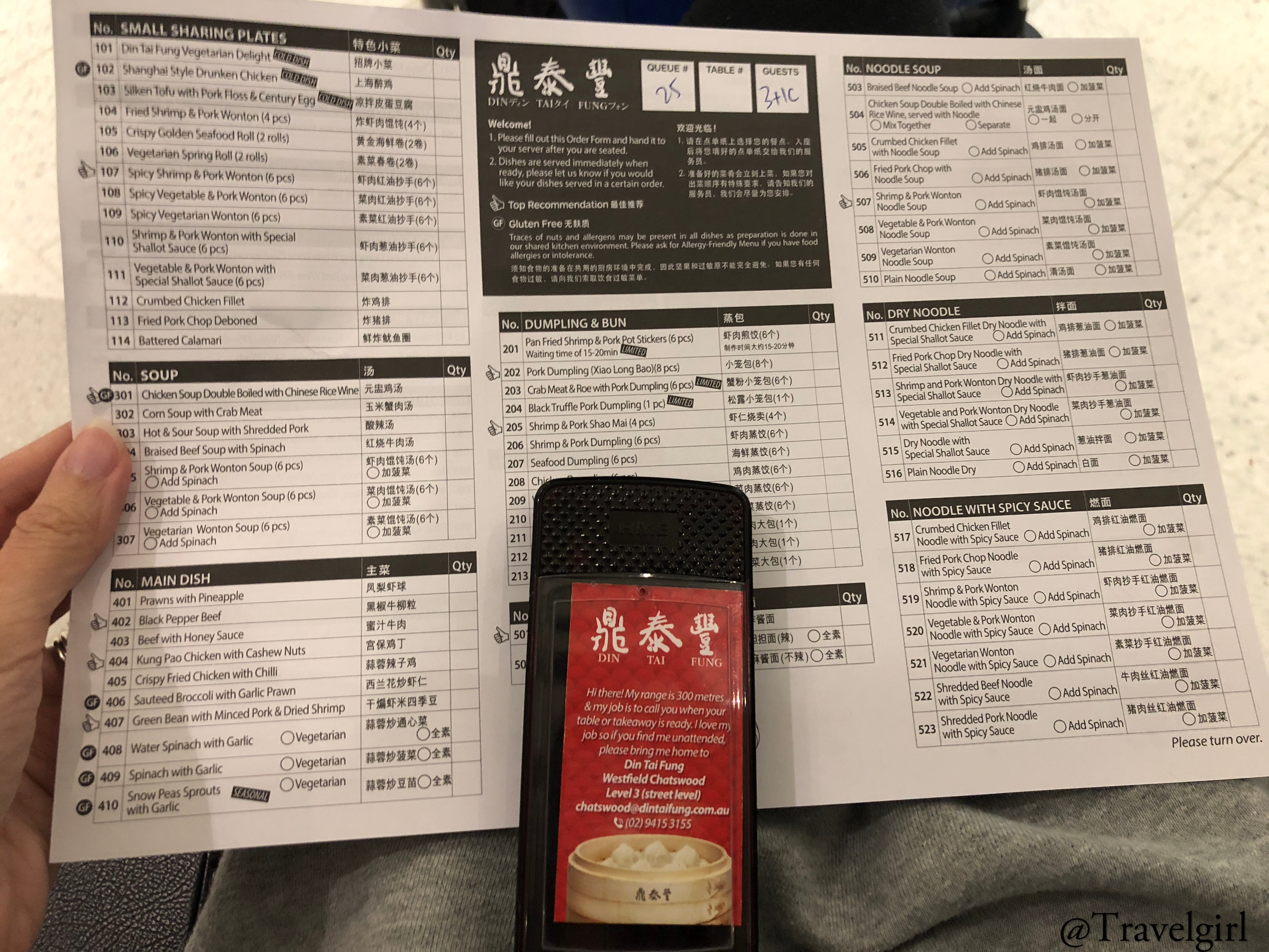 Today I would like to share a restaurant we go often as the whole family loves the food and there is something for everyone. Din Tai Fung is a dumpling chain started in Taiwan and there have been a few branches opened in Sydney. It is always busy so we try to get there just before the lunch crowds arrive. Once I registered my name and number of guests, I was given the menu and a buzzer. We waited around 10 minutes and got a table towards the back of the restaurant.