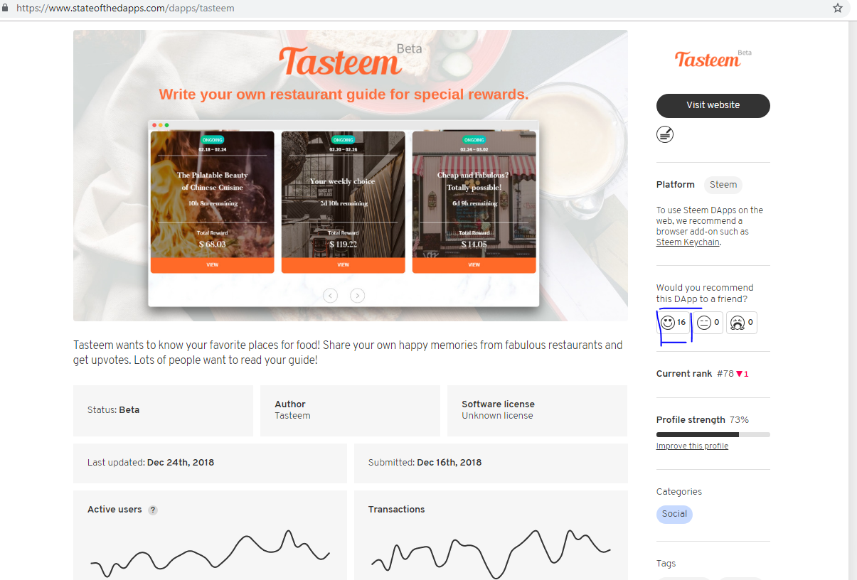Vote Tasteem in Stateofthedapps for higher rank. I think more people have to share different restaurants and we can read about different cultures what people love to eat and drink in different places of the world. Number of current users of Tasteem has to increase somehow, this is maybe what I would love to see more in tasteem.