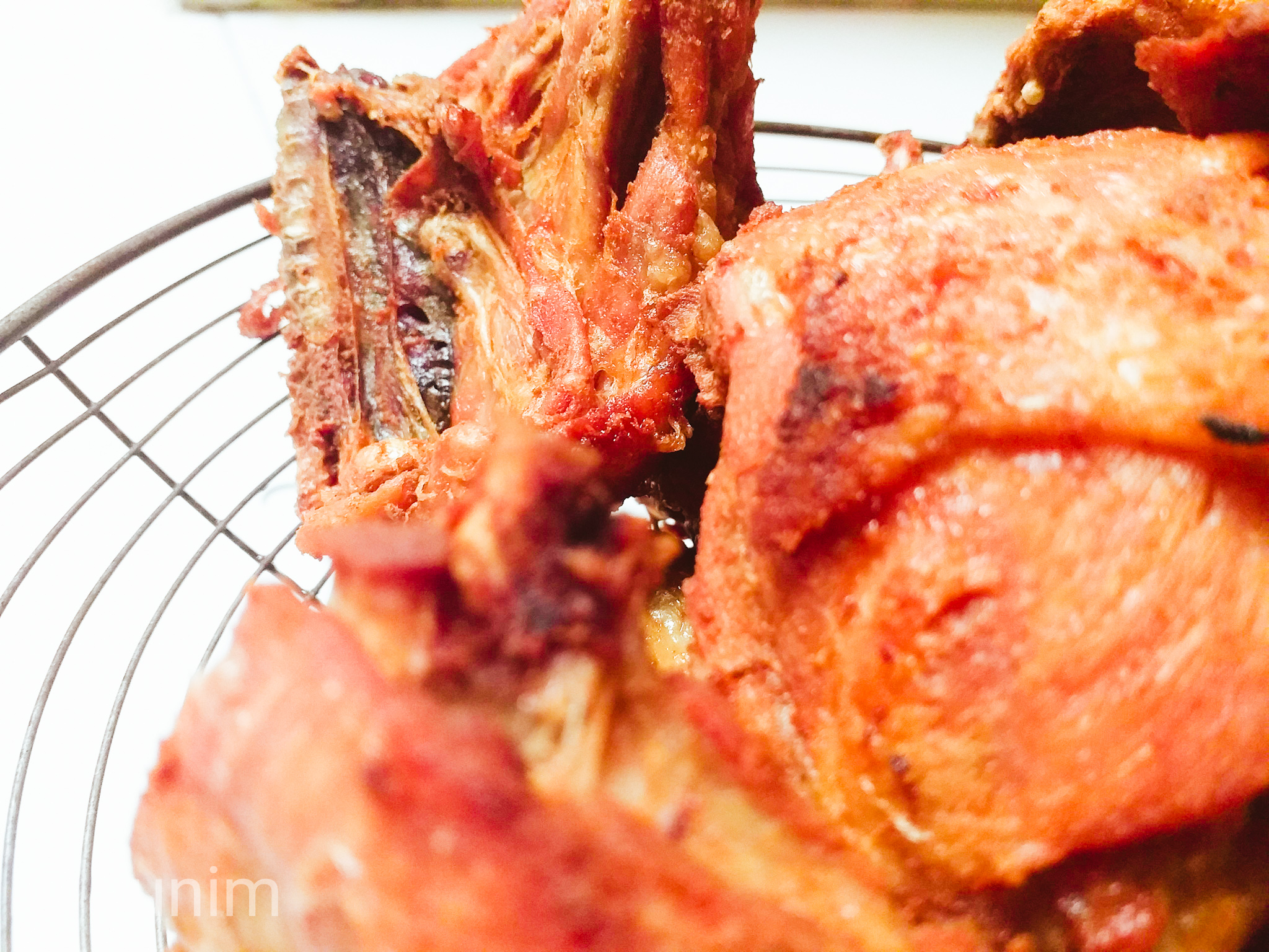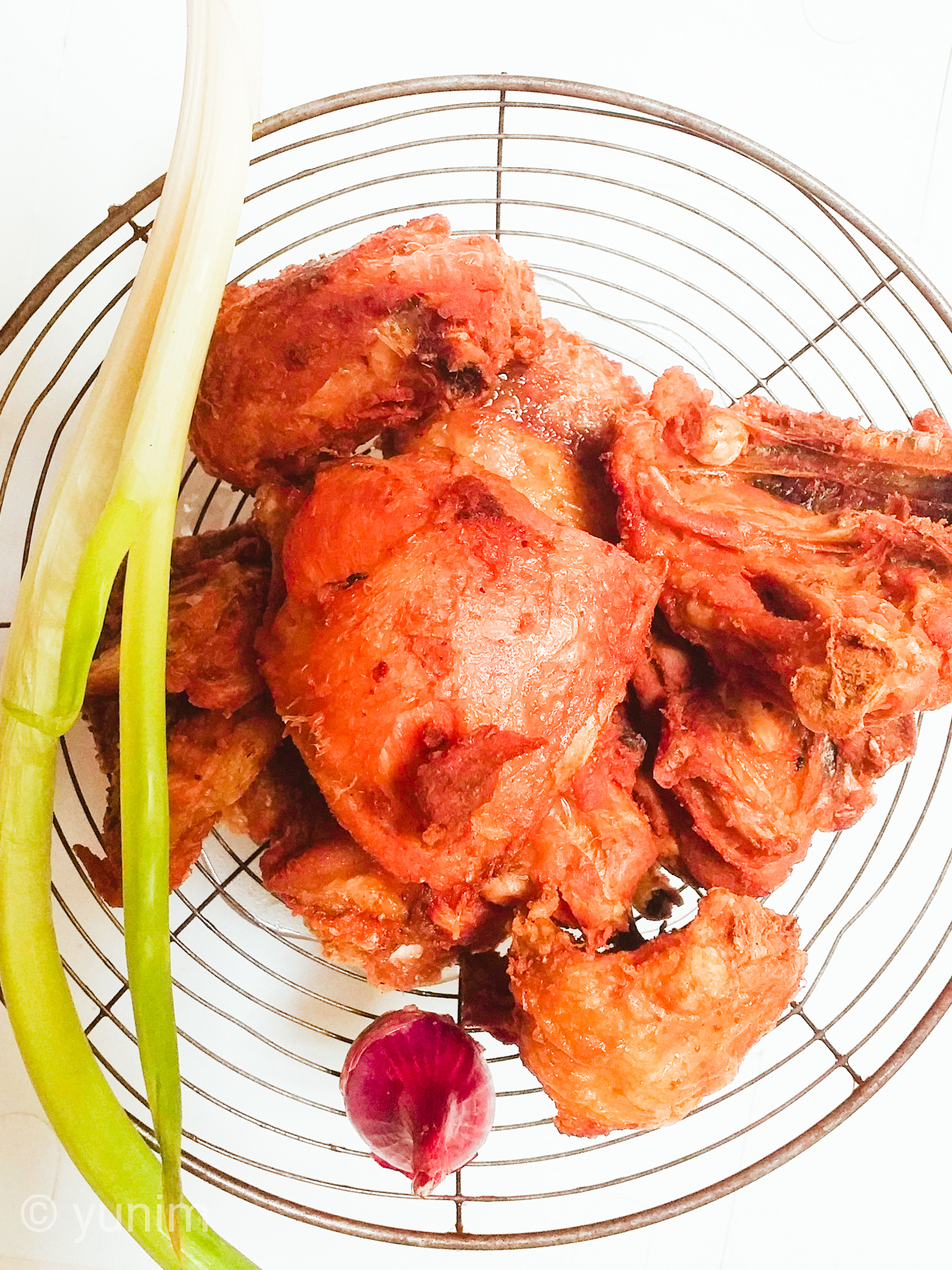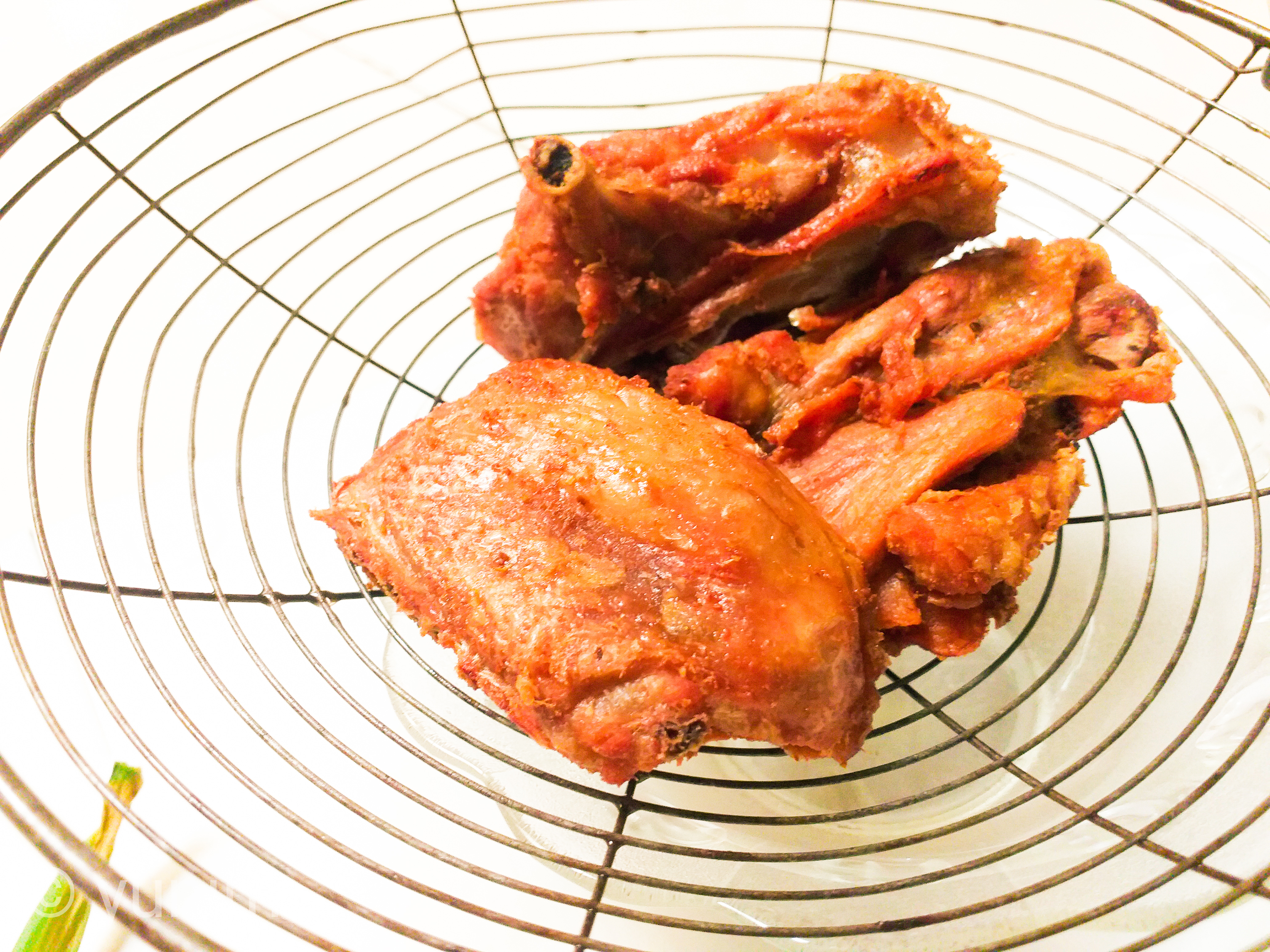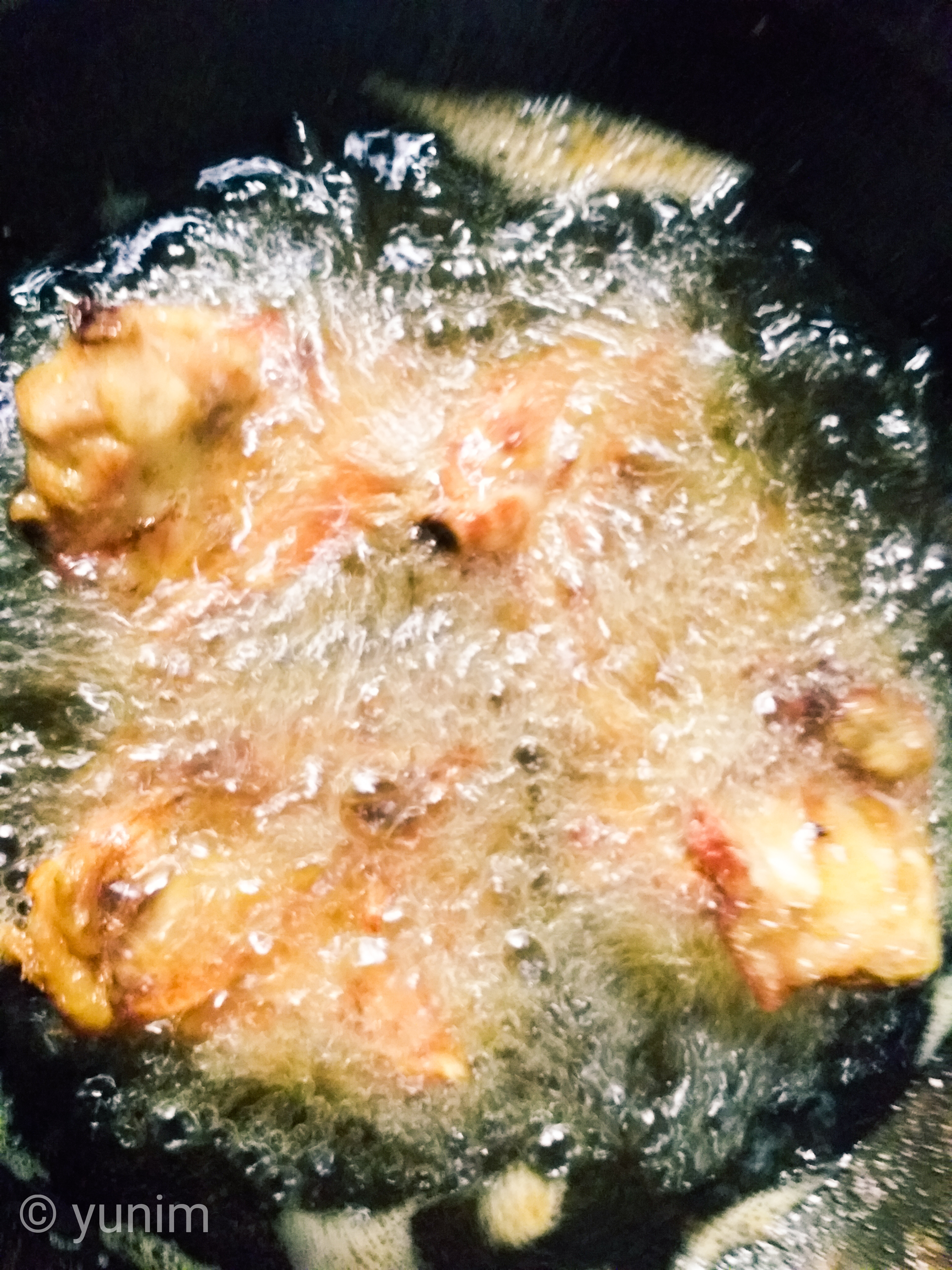 Dengan api yang tidak terlalu besar, saya mulai memasukan satu per satu potongan ayam ke dalam penggorengan.