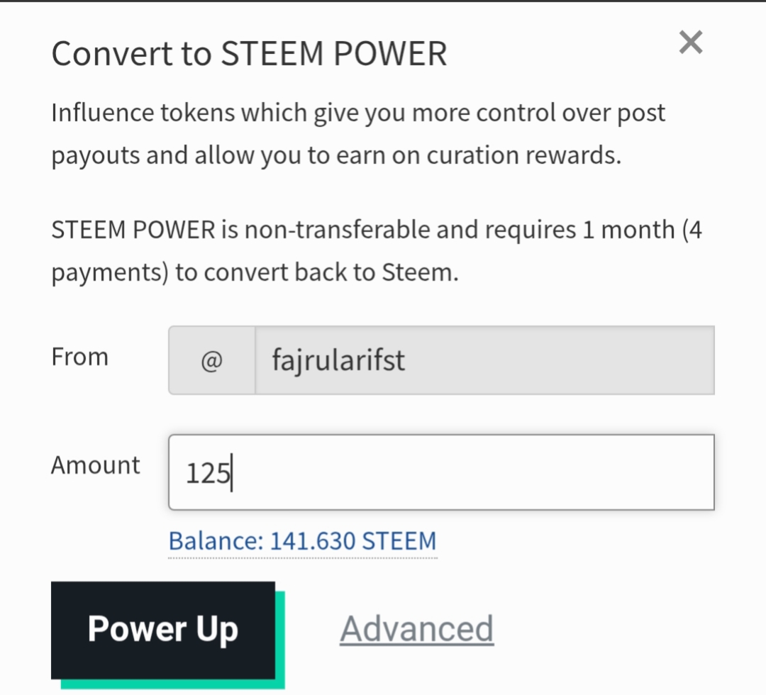 Then I was directed to enter the nominal value of Steem, I wrote down the amount of 125 that will be Power Up