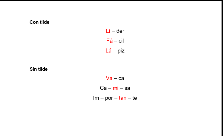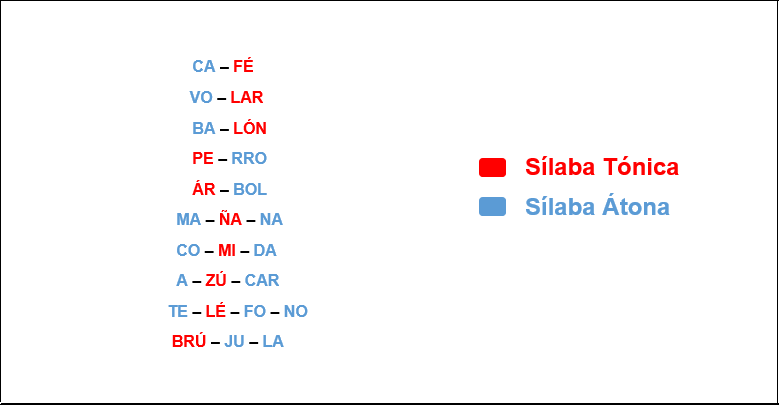 Cuando pronunciamos, descubrimos en el sonido de cada término; un cierto matiz e intensidad discrepante. Al disociar en sílabas una palabra, percibimos con naturalidad una mayor fuerza en la pronunciación de una sílaba. Esta sílaba se llama: sílaba tónica. Que a diferencia de la sílaba átona, podemos escribirla con una tilde para denotar que allí existe dicho énfasis.