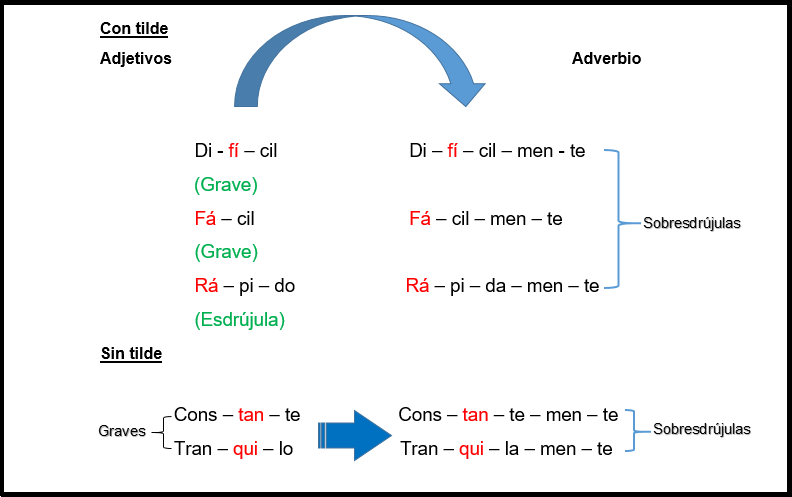Una singularidad de este conjunto de palabras es cuando los adjetivos se transforman en adverbios. Es decir; cuando tomamos un adjetivo ya sea grave o esdrújulo y lo convertimos en un adverbio.