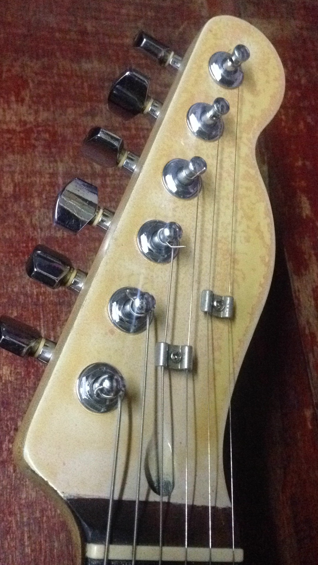 Headstock asal sebelum ini lambang squier namun saya telah men spray nya kepada warna kuning langsat serta menambah varnish untuk memberikan warna kekuningan pada headstock ini.