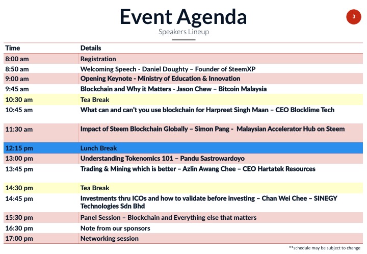 With a strong lineup of speakers who has confirmed to come for the event and support us , we have well established community builders, reknowned blockchain developer / consultants to crypto exchanges who would be embedding steem into their exchange once they get hold of someone in charge =)