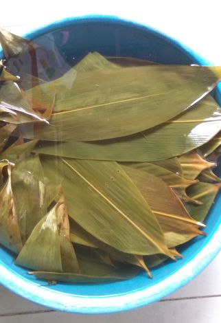 the bamboo leaves 竹叶 - need to soak the dry leaves overnight ,boil it for 10 minutes, and then re-soak it overnight for it to be flexible.