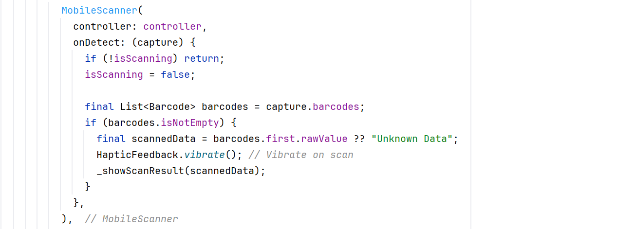 This is the code which provides direct scanning from the camera. It uses the functionality from the mobile_scanner package and detects the live QR codes and after scanning then it returns the result. It takes care to not scan the same Qr code again and again in one turn. If a QR code passes through the camera it scans it ad shows result if it again comes in front of the camera the camera will ignore it.