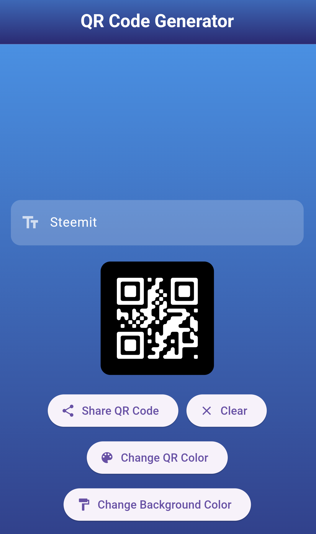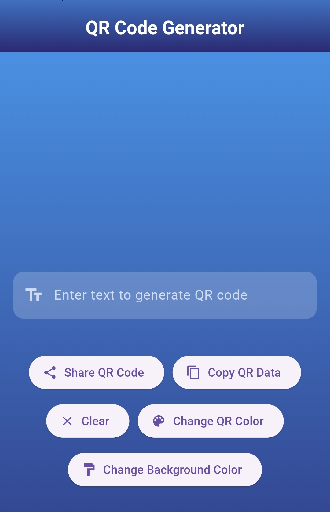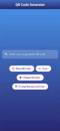 This is the complete interface of this screen. It allows the user to navigate and interact with this screen with the ease of use. I have made everything simple so that anyone can easily use this feature without any prior interaction. The input has a hint text to inform the user to enter any text to generate the QR code.