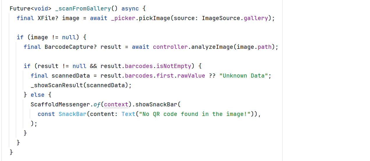 This is the logic to scan the image by picking it from the gallery. First of all it checks it checks if the image is selected or not. If the image file is not null then it passes the it mage to the analyzeImage through its path and it scans the image and finds the QR code on the image. If there is a bar code on the image then it returns the decode of the qr code otherwise it shows exception.