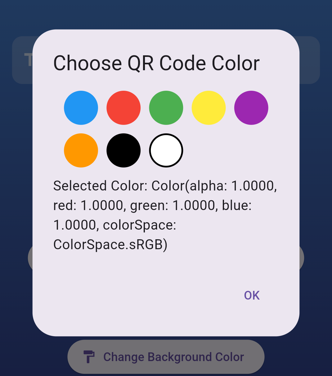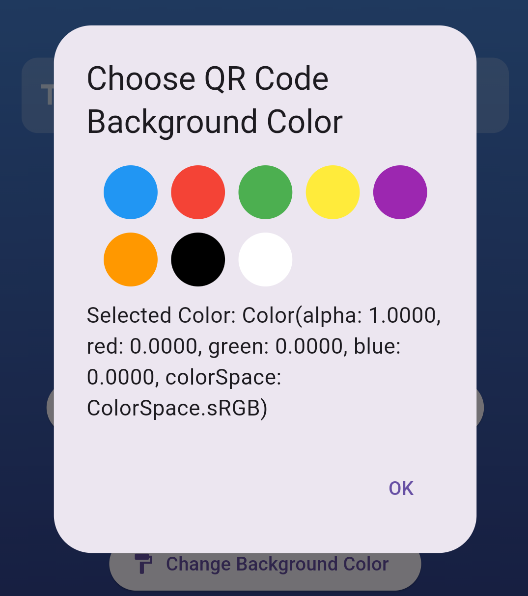 When the user click on the chnge background colour then there is a pop up with the pre-defined colors. I have chosen here black color as the background of the QR code.