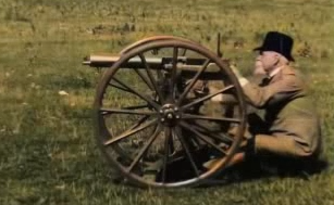 Sir Hiram Maxim testing his invention, the machine gun, 1897.