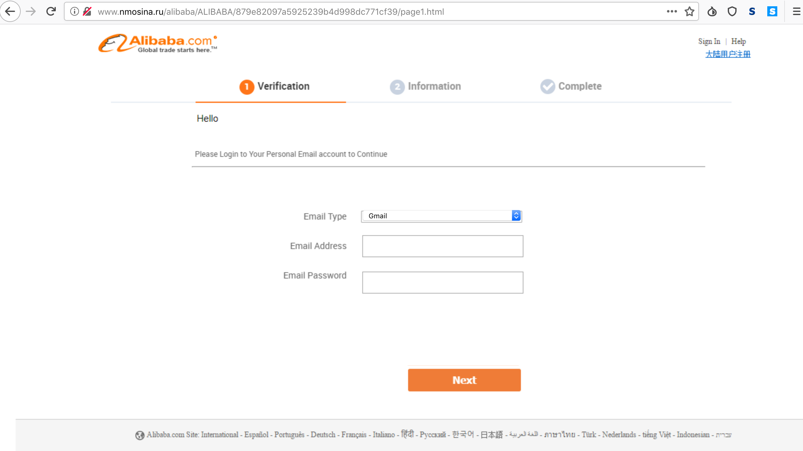 Notice the MD5 looking string in the URL? We will get to that later. But for now, lets click through and see what happens next... And what happens is, it asks you to log into your personal email to verify your identity! Seems legit? It defaults to Gmail, and if you follow through here, you get to the next stage. Otherwise, you get bounced to Alibaba.