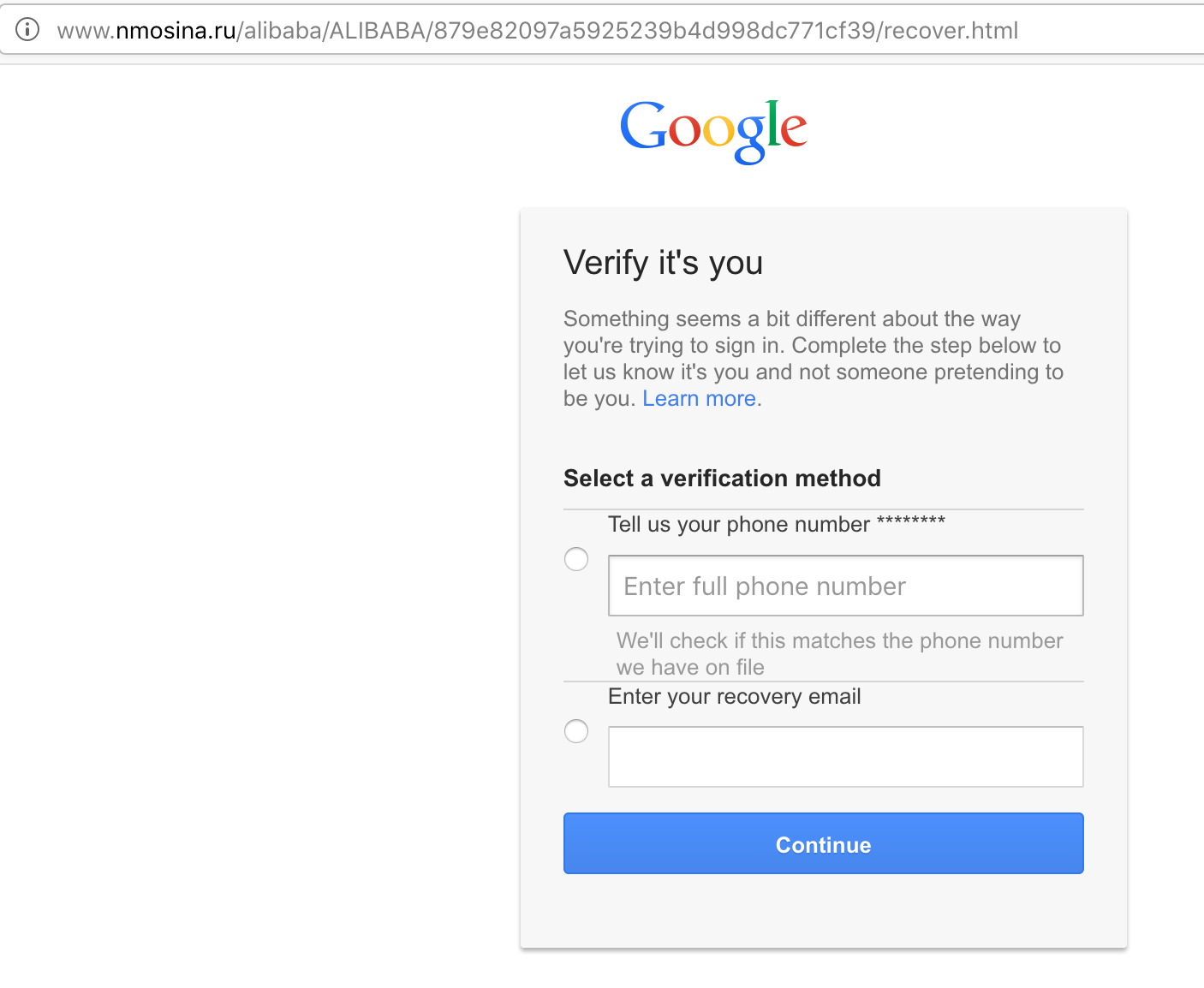 So now that they have snarfed your Gmail creds, they go so far as to ask you for your Gmail account recovery information by impersonating Google on the next page, which is a nice touch. After this, you get bounced to the real Alibaba website. At which point, you notice it looks different, and probably smash your face into your keyboard.