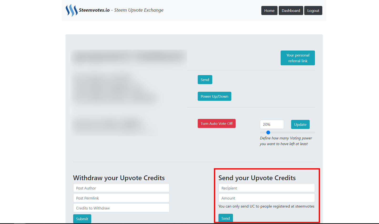 If you visit your dashboard today, you'll see that new area in the lower right of your screen, which says "Send your upvote credits". With this field you can send your credits to other users on steemvotes.io.