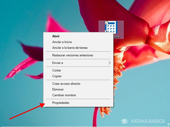 Después de crear el acceso directo, ve al Escritorio y haz clic con el botón derecho del ratón sobre el icono. Eso abrirá un menú contextual, en el que debes hacer clic en Propiedades. Si te es más fácil, esto es lo mismo que seleccionar el icono y luego pulsar Alt + Intro.