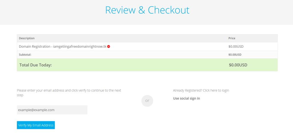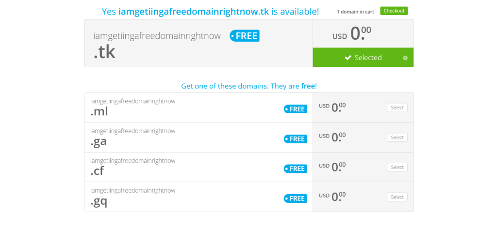 Now check if the domain is available. If it’s unavailable then there is no need to panic, there would be another available domain that ends with ".ml" or something similar, choose from those. After choosing the domain, click on the small "Checkout" button at the top right corner.