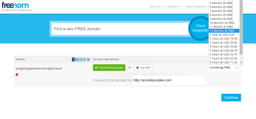 Now chose the time period for owning the domain from the drop-down menu on the right. It would exceed up to 12 months, beyond that it wouldn’t be free. Also, if you want to forward this domain to another site, you can do it right now, but if you are unsure then just proceed because this can be done later on. Click "Continue" to proceed.