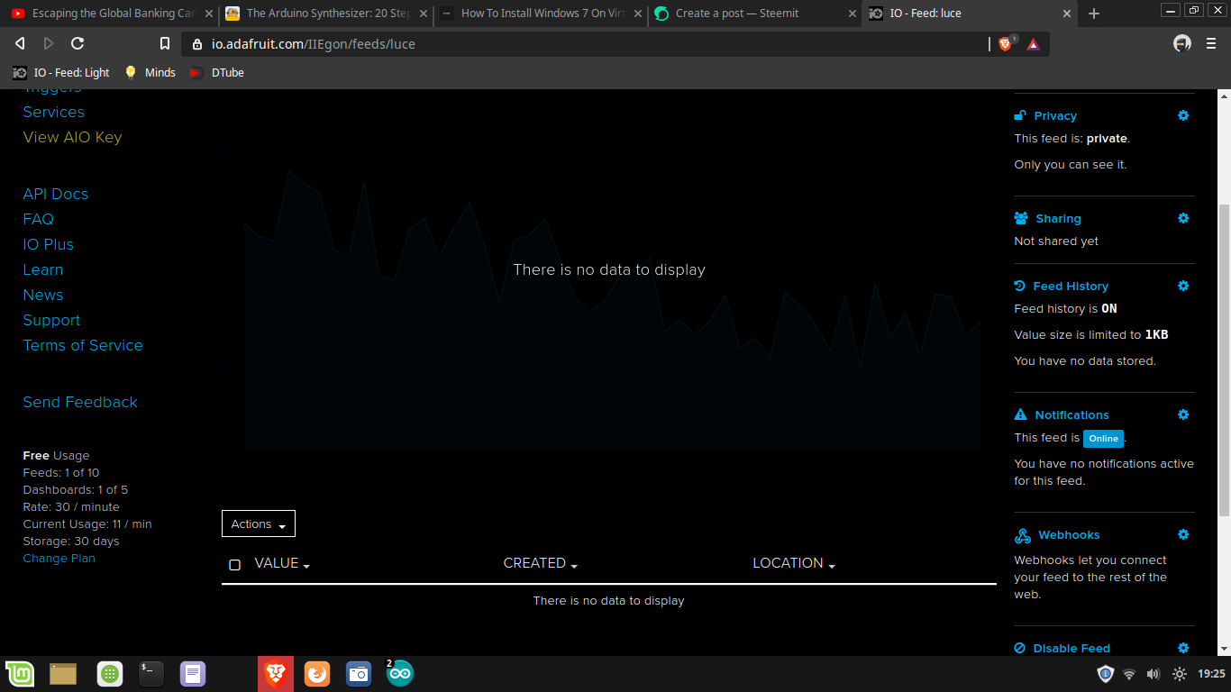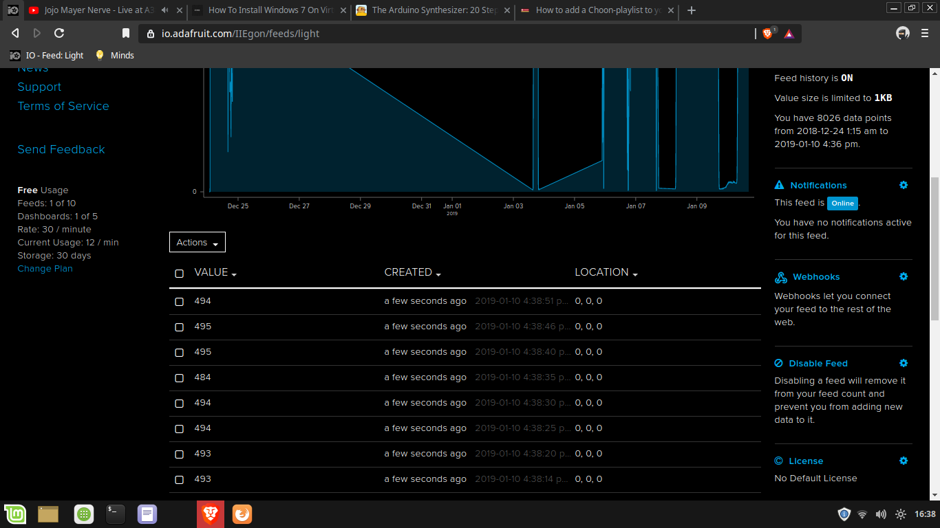Now you should see your feed on Adafruit IO full of numbers, the ESP8266 reads the LDR and sends data to the IO every 5 seconds, so in a minute or 2 this should be the result!