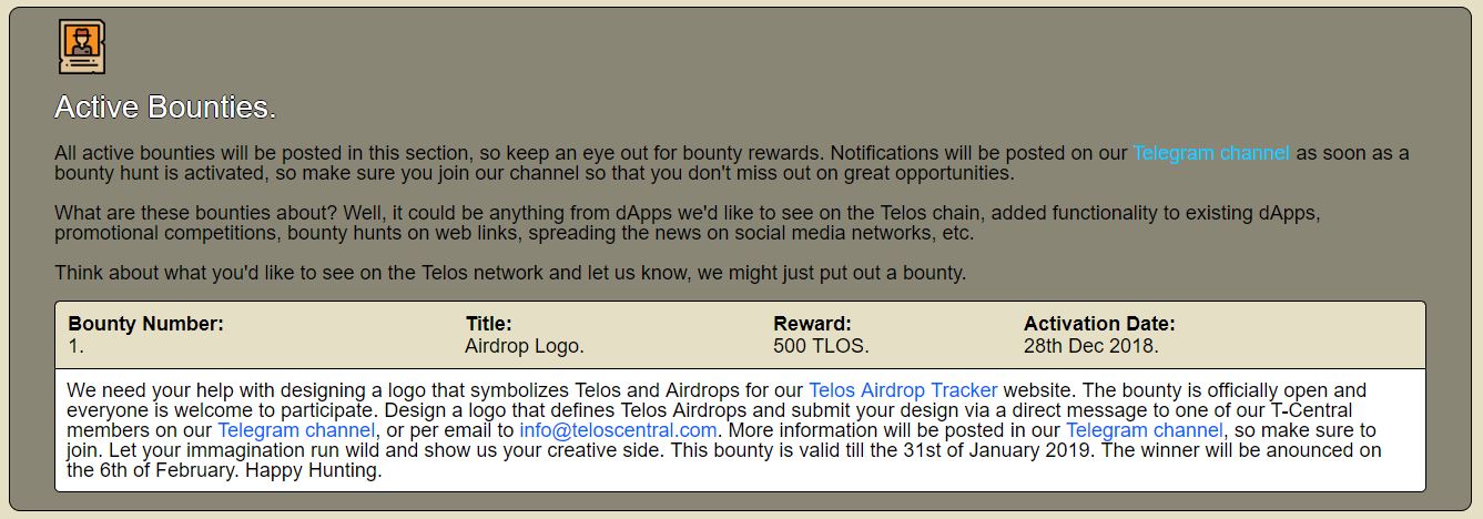 What are these bounties about? Well, it could be anything from dApps we'd like to see on the Telos chain, added functionality to existing dApps, promotional competitions, bounty hunts on web links, spreading the news on social media networks, etc.