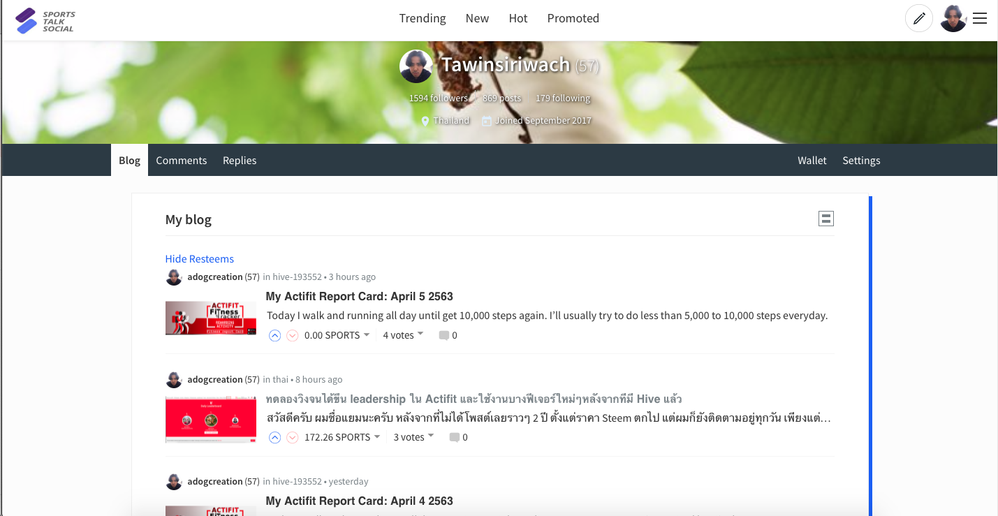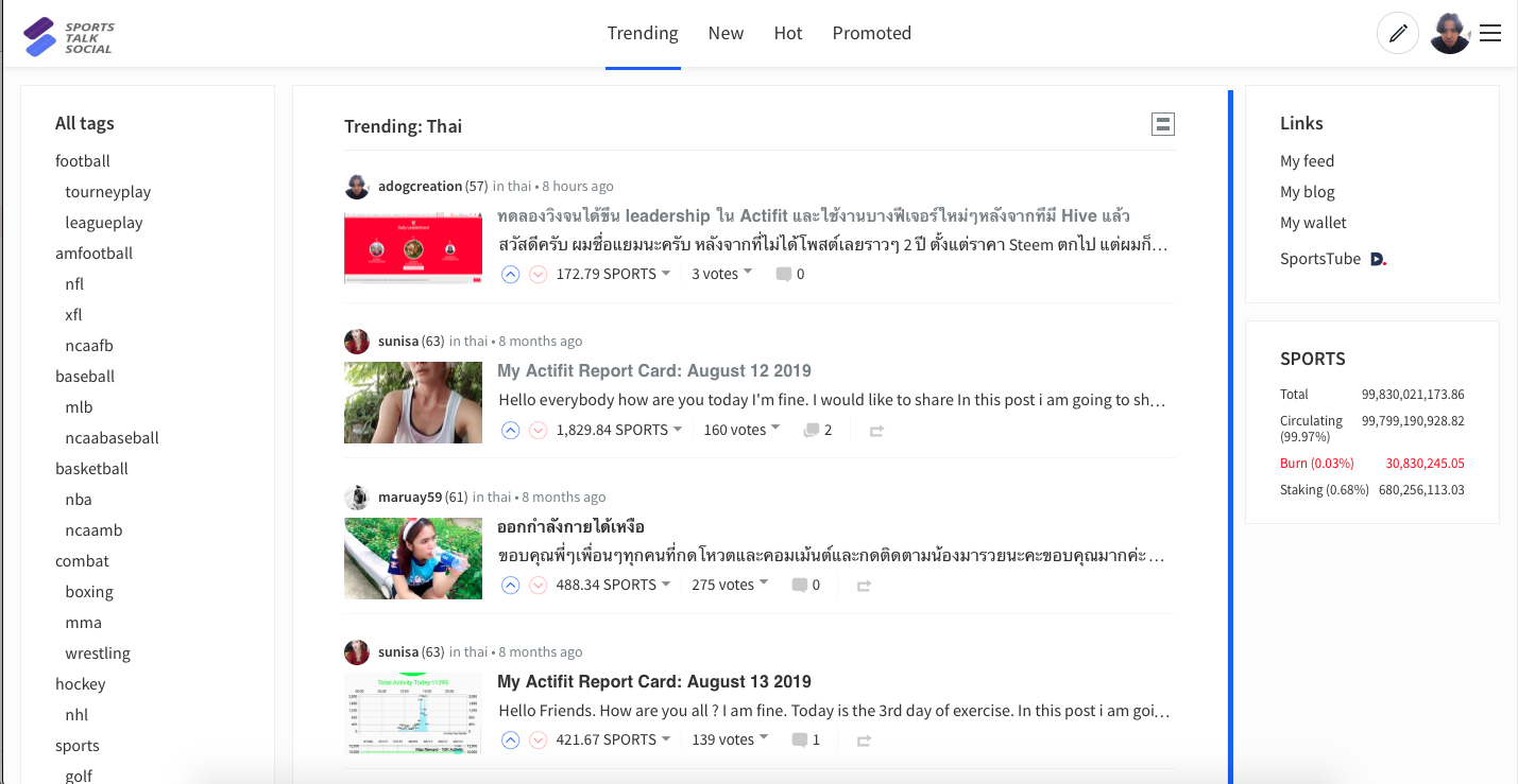 เมื่อลองเสิร์ชเว็บจาก steem-engine พบว่าเว็บ sportstalksocial.com หน้าตาคล้าย steemit กับ hive เลย เพียงแต่ค่าเงินจะเป็นของ Sports และค่าเงินจะดูเยอะๆเป็นร้อยเป็นพัน Sports ต่อโพสต์ ซึ่งผมได้ลองเสิร์ชกับโพสต์ที่มี tag thai และหน้าแรก พบว่าโพสต์ที่จะได้เหรียญนี้มามีอยู่ 2 กรณีด้วยกัน คือ