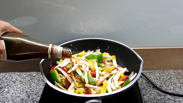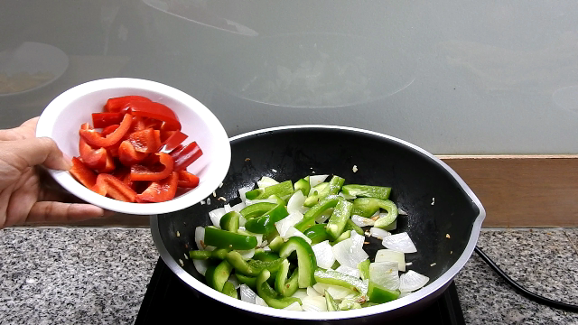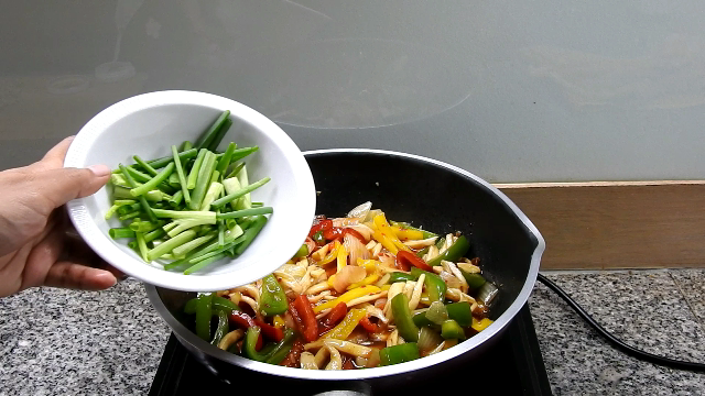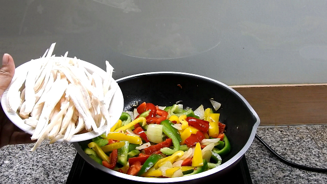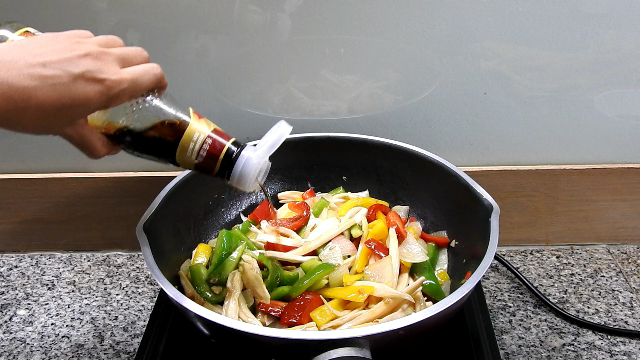 3 Put the onions to stir for a moment, add sweet peppers and king oyster mushroom into stir fry together.
