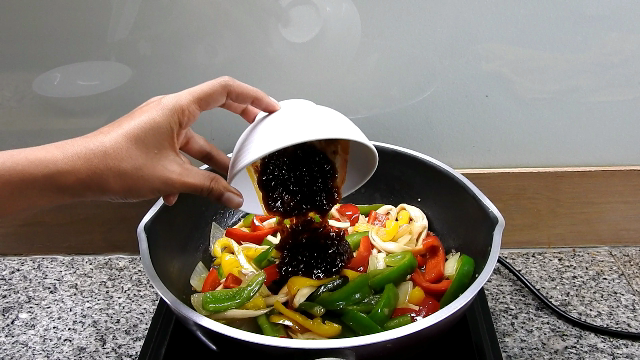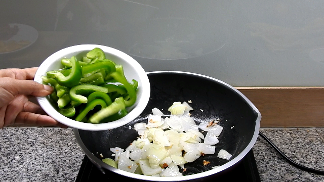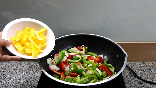 3 ใส่หอมหัวใหญ่ลงไปผัดสักครู่จึงเติมพริกหวาน 3 สี และเห็ดออรินจิลงไปผัดด้วยกัน