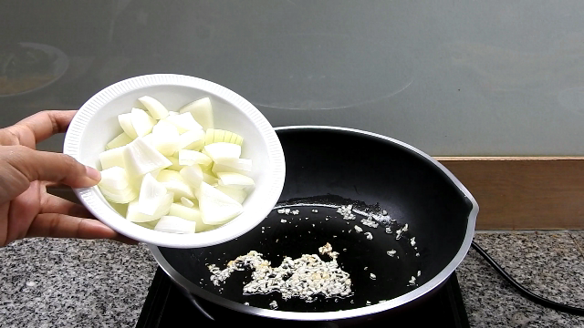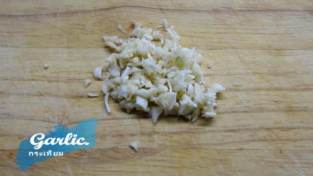 2 ตั้งกระทะใส่น้ำมันพืชเล็กน้อย และเติมกระเทียมลงไปผัดจนหอม