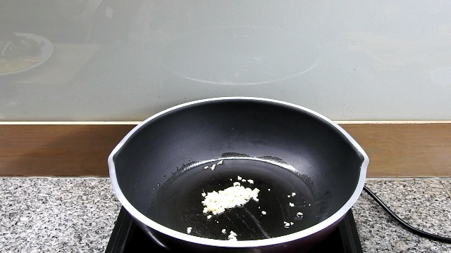 2 Put a little vegetable oil in the pan, add garlic into stir fry until fragrant.