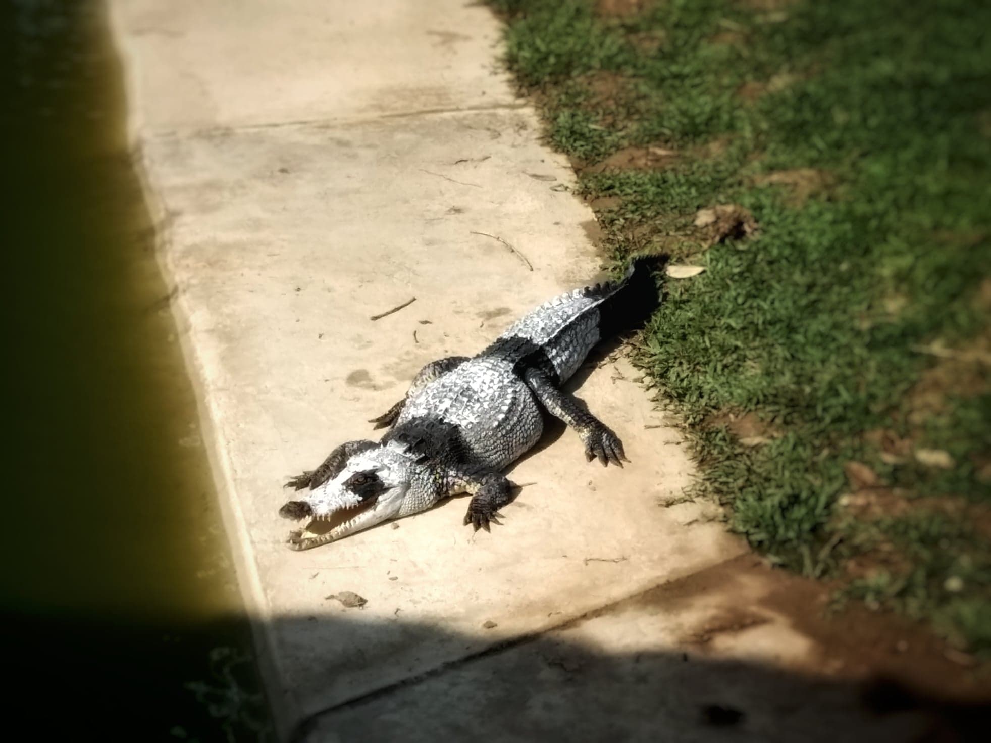 ผมเจอจระเข้ตัวนี้ที่บึงฉวาก จ.สุพรรณบุรี แวบแรกที่เห็นก็นึกว่าของปลอม ผมมองอยู่ตั้งนานเพื่อดูว่ามันจะขยับได้ไหม เพราะไม่คิดว่าจะมีคนเอาสีไปทาบนตัวจระเข้ได้ทั้งตัวโดยไม่โดนกินไปซะก่อน หลังจากยืนดูอยู่สักพักก็ยืนยันได้ว่านี่เป็นจระเข้จริงๆ ที่สำคัญคือผมอยากรู้มากว่าเขาทำให้จระเข้อยู่นิ่งๆจนระบายสีจระเข้ทั่วทั้งตัวได้อย่างไร