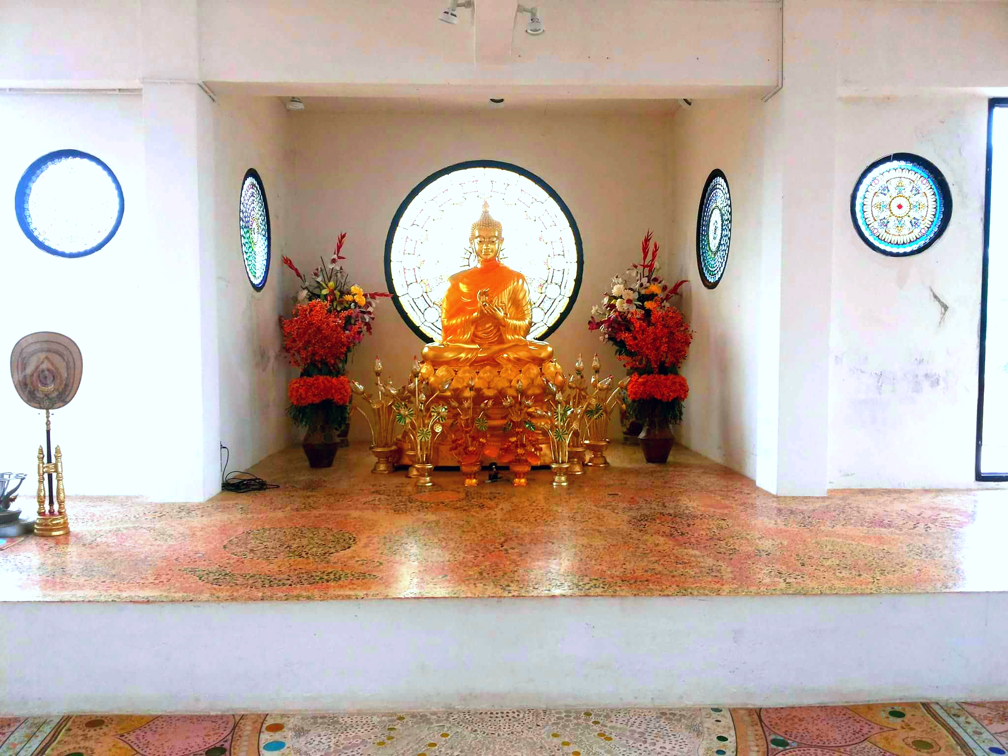 ถ้าเป็นเพื่อนๆเดินเข้าไปข้างในจะเห็นพระประธาน ตั้งอยู่ และด้านหลังก็จะเป็นธรรมชาติรอบองค์พระ อย่างสวยงามครับ และพื้นที่เหยียบย่ำจะ เป็นรูปศิลปะต่างๆ ที่นักศึกษาได้มา แสดงศิลปะบนพื้นแห่งนี้ วิจิตรมากๆครับ ผมสังเกตกับศิลปะบนพื้นอย่างนี้จัดเป็นรูปดอกไม้ ได้เป็นรูปศิลปะต่างๆ รูปธรรมชาติและความรู้สึกของนักศึกษาที่วาดฝากไว้ลงบนพื้นแห่งนี้