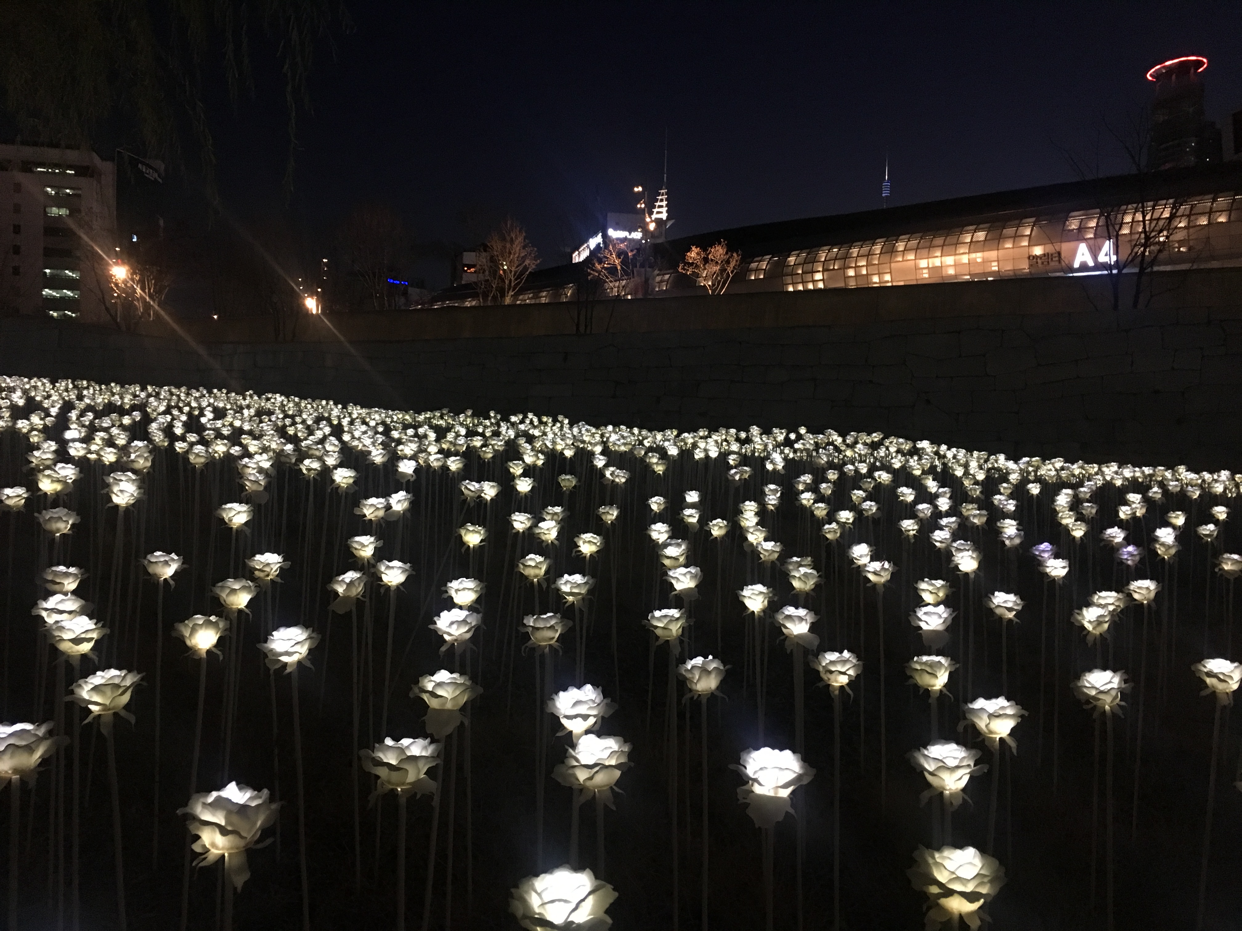 🌹🌹LED Rose garden ที่ DDP นี้ เป็นดอกกุหลาบประดิษฐ์ที่ติดหลอดไฟ LED สีขาว 25,500 กว่าดอก ประดับไว้ที่ลานดิน เมื่อก่อนถ้าไปโซลไม่ถูกช่วงเวลาก็คงอดดูภาพสวยๆแบบนี้ แต่ปัจจุบันได้เปิดแสดงให้ดูทุกคืนตลอดปีกันเลยทีเดียว ถ้าใครไปถึงในช่วงหัวค่ำก็จะเห็นเป็นเพียงดอกกุหลาบเสียบเสาโล้นๆ ^^เรายังแอบคิดว่าดูรกๆยังไงไม่รู้ แต่พอฟ้ามืดเปิดไฟเท่านั้นแหละ ดูสวยละลานตากันไปเลย ยืนดูนานๆก็ได้ไม่เบื่อเลยแต่หนาวหน่อย และเนื่องจากมีการแสดงตลอดทั้งปีบรรยากาศในการชม LED Rose garden จึงแตกต่างกันตามแต่กิจกรรมที่จัดในแต่ละฤดู ช่วงฤดูใบไม้ผลิถึงใบไม้ร่วงจะมีตลาดนัดขายของ และของกินอร่อยๆ แต่เราชอบบรรยากาศฤดูหนาวมากที่สุด เวลาที่ไฟสว่างที่สุดจะรู้สึกว่าอุ่นขึ้น แต่เวลาที่ไฟค่อยๆหรี่แสงลงก็รู้สึกว่าอากาศหนาวขึ้น🌹🌹