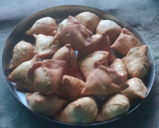 I had my lunch of rice dal and vegetables.went for a nap. After taking a small nap.I got up and go to our local market for purchase some vegetable.After get back home .I saw my mother making a samosa.I had some spicy snacks which was samosa that too homemade.while watching a news on television.