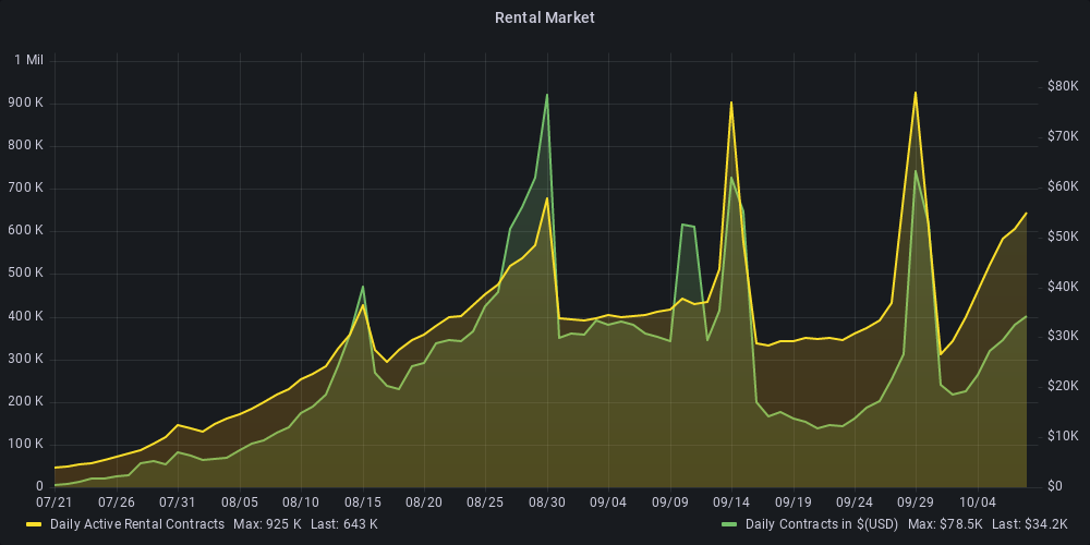 I like to check the overall rental market from time to time, and I often use the discord tool above. You can see very clearly how the rental market shaped up after the recent growth, implimentation of new rules and modifications. Above is the history of the last 3 months. It is easy to see the demand and rental price spike towards the end of the season. A season is 15 days. If we consider the Aug15 the first real spike on rental, the pattern seems to repeat at every season. I have we have now achieved a stability at 900K card rented at about $80K peak. There is recent modification of the cooldown to 24 hours and growth have been steady this season throughout the season.