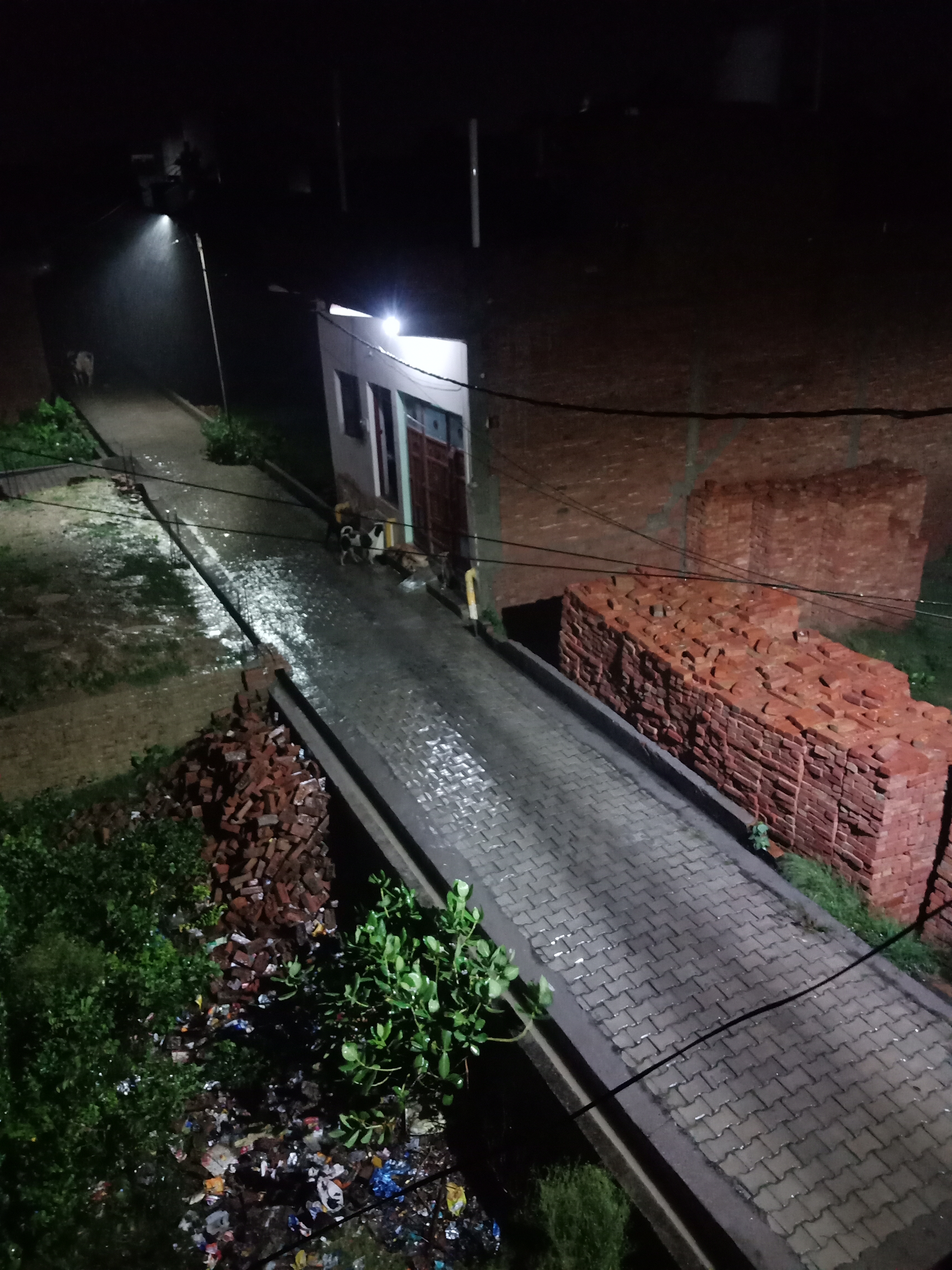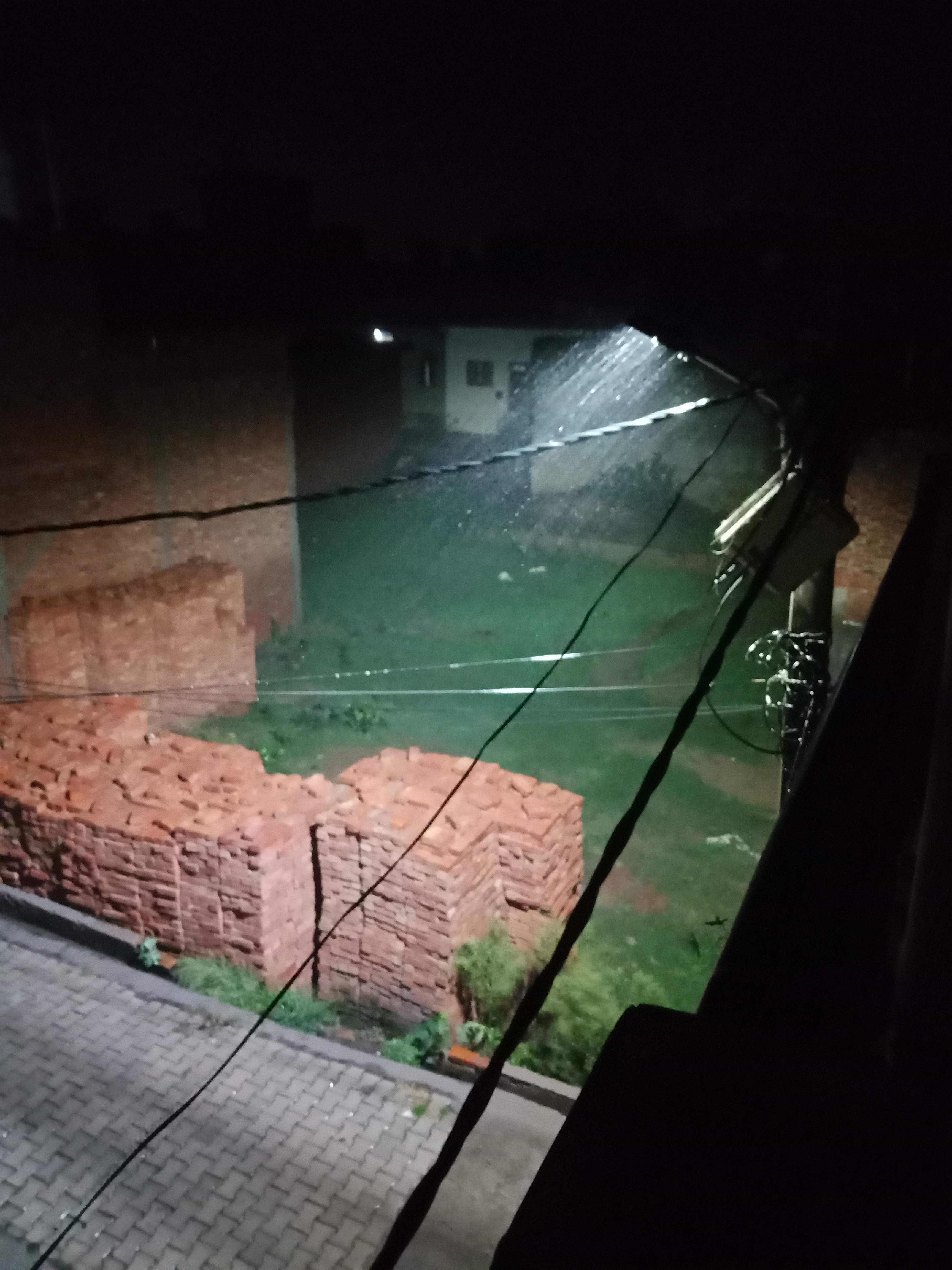 AT 8:20PM , then the brother and father came back to home from shop. Then mother called to me for preparing the plates for dinner after that taking dinner with family then went to on terrace with family for convertation . Then after some time the cloud was thundering so after that rain was start then i click the rain photos in the street light .