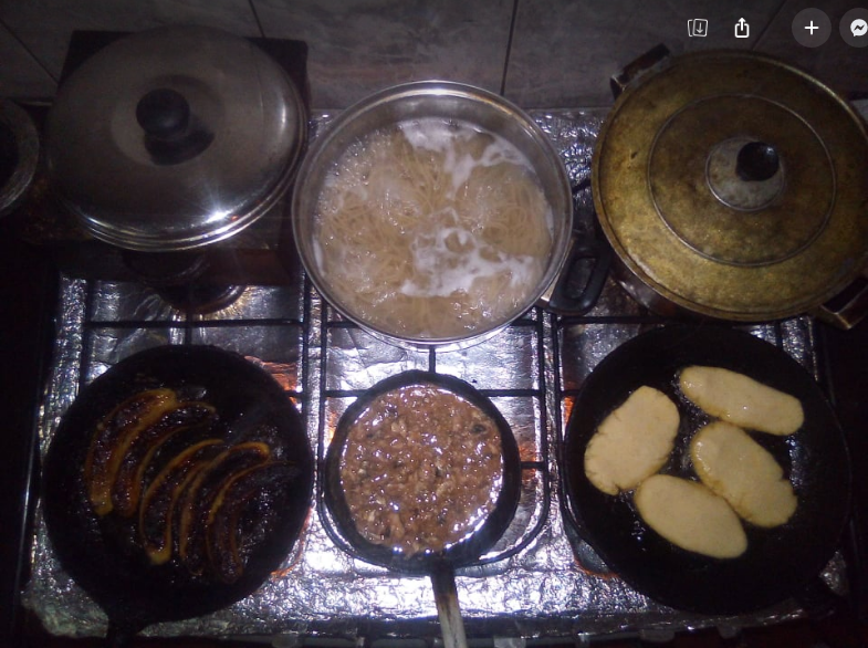 Almorzamos un rico plato de pasta larga, sardina en salsa, cambur frito,boyo frito, queso rayado y un jugo de guayaba