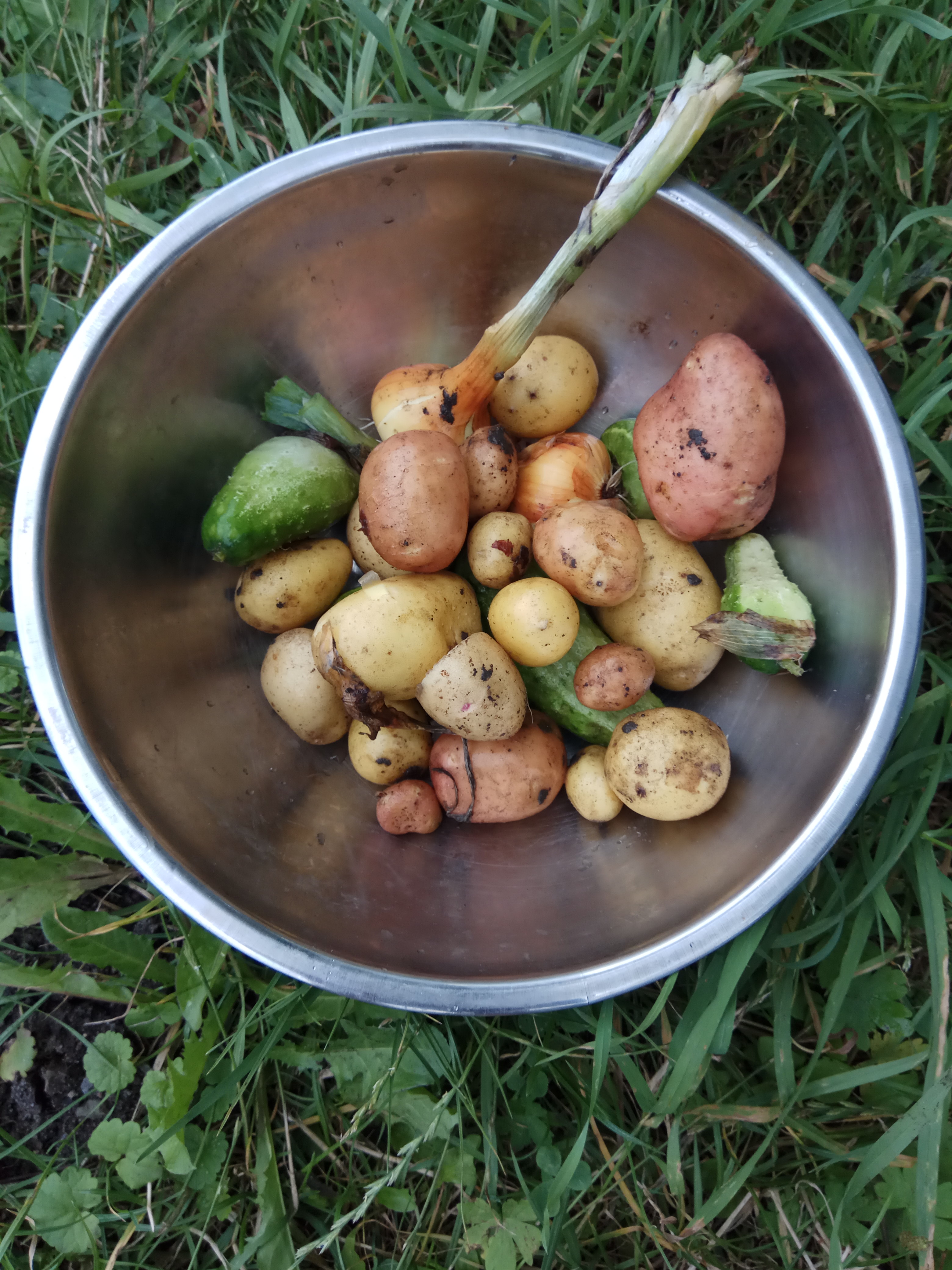 По ходу, пошла на огород, копнула несколько кустов картошки, вырвала несколько луковиц, и огурцов. Картошка еще не выросла, много маленькой, а вот лук хороший, огурцы заканчиваются.