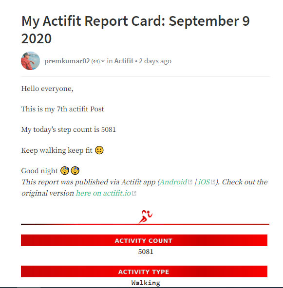 आज मैंने अपना छठवां एक्टिफिट का पोस्ट किया । आज मैं 5081 स्टेप चला ।