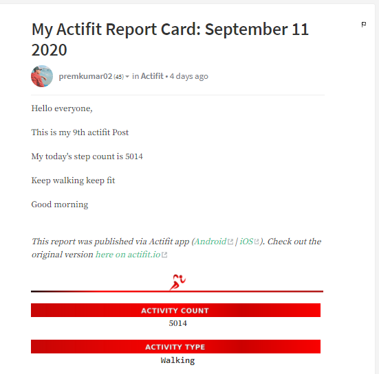 आज मैंने अपना सातवां एक्टिफिट का पोस्ट किया । आज मैं 5000 स्टेप चला । इस वजह से आज का मेरा actifit भी उतना अच्छा नहीं रहा पर मैं 5k तक पहुंच गया।