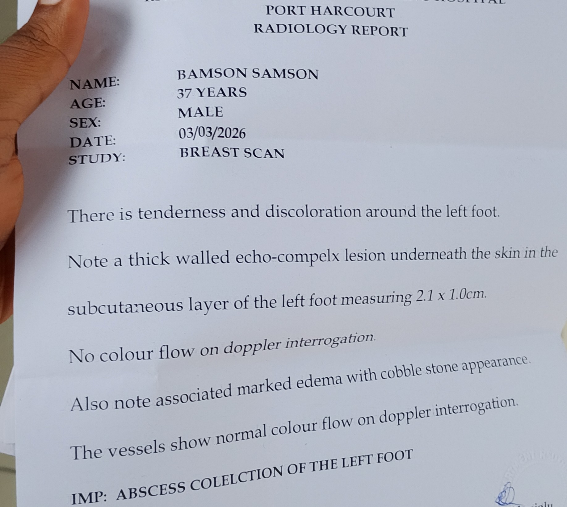 Is been a month, I've been coming to and fro from the hospital. This is actually the scanned report. Imagine the fear, when I first saw "breast scan" on the report. I was like, when did I start growing breast on my legs?? I was actually curious to read to the ending, to know what this people had written here. As you can see, it was a mistake on the part of the typist. I'm guessing that they have had so many women on their scanners, they have forgotten to change the "study".
