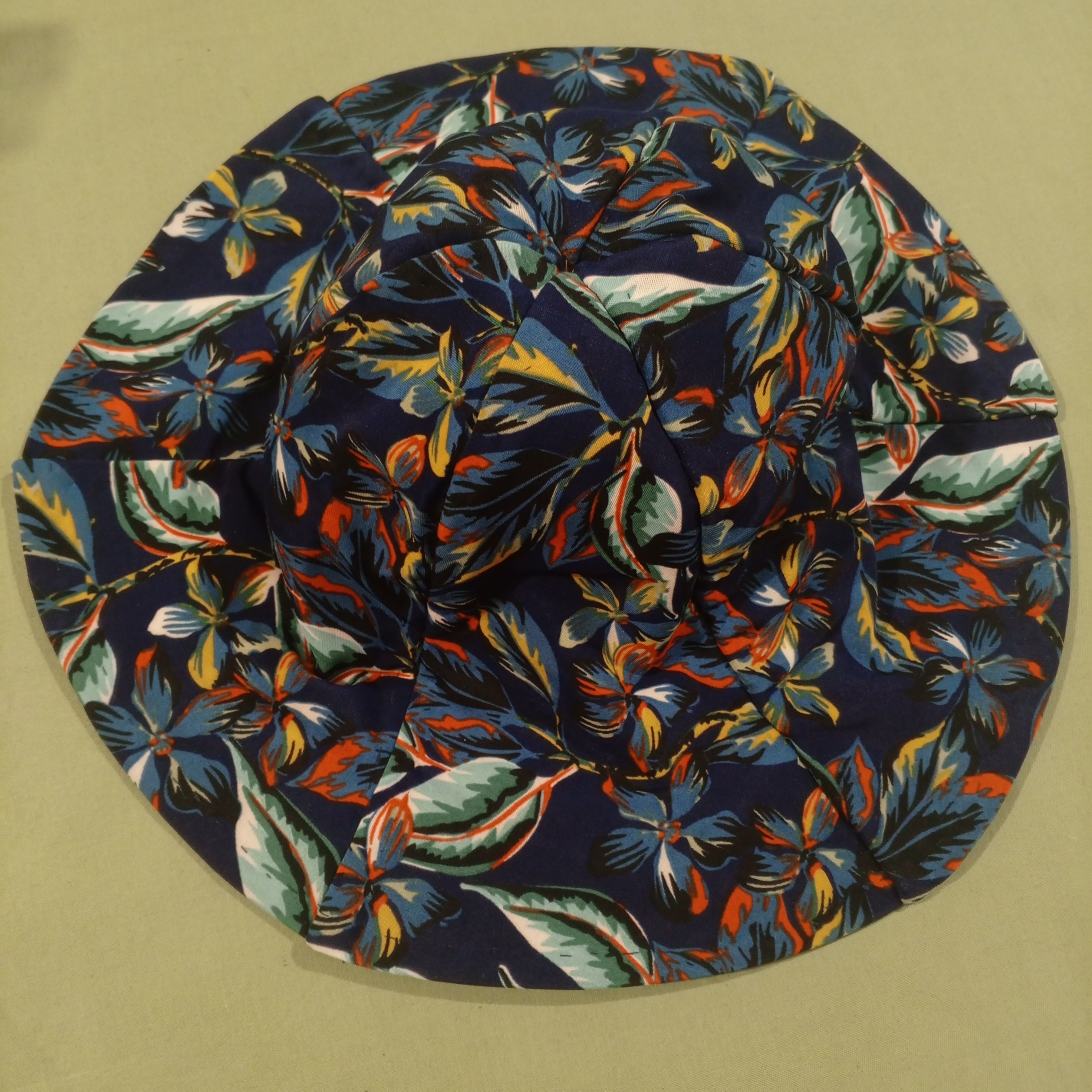 Pensaba utilizar unos retazos de sesgos que tenía en casa y hacer los que fuera necesarios con retazos de tela, pero al momento de cortar la segunda tela, pensé en dejar un borde lo suficientemente amplio para que ella misma me sirviera como vivo visible al otro lado del sombrero reversible. Además me ahorraría muchas puntadas al estar confeccionando la prenda a mano.