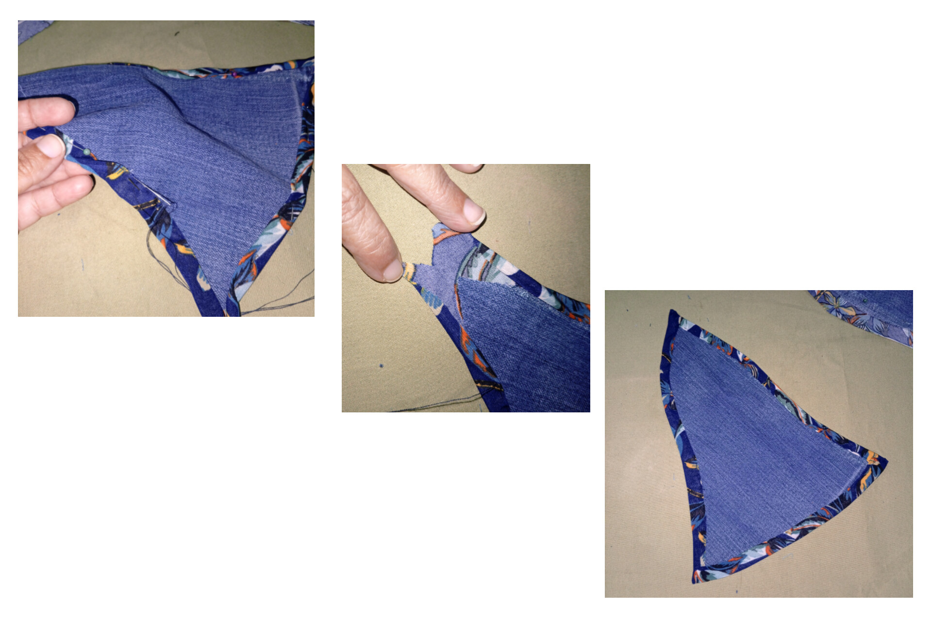 Las telas ya estaban fijadas revés con revés con alfileres. Solo fue cuestión de ir haciendo los dobleces y cosiendo por los bordes. En las esquinas necesité cortar algunos sobrantes de tela.
