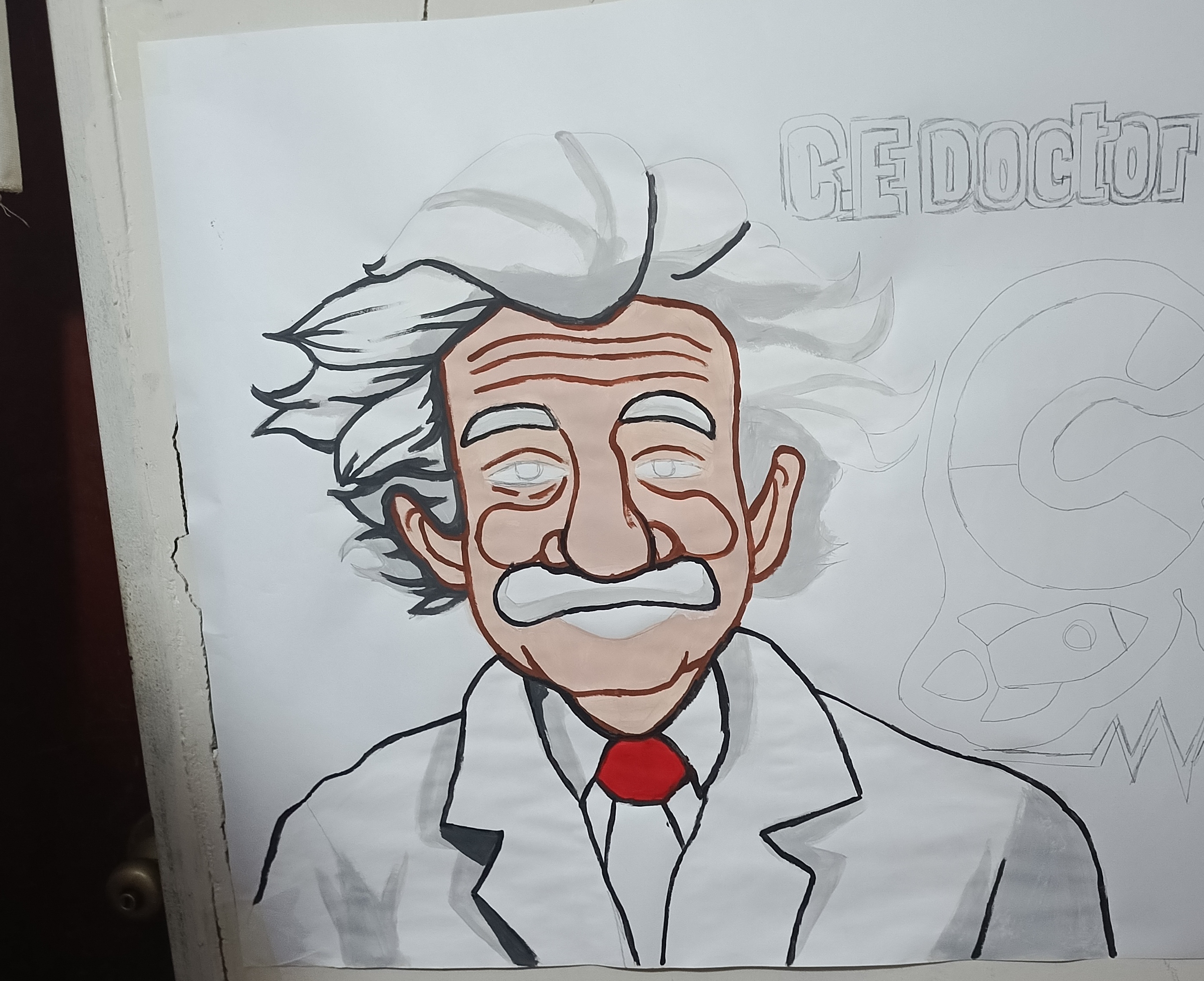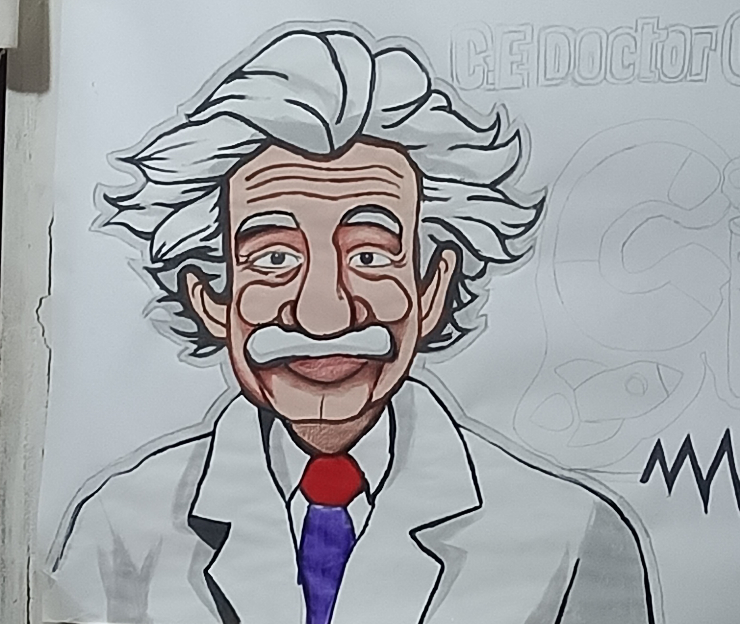 Después de darle color a este dibujo , empecé a dibujar los jóvenes científicos con la misma técnica que usé para dibujar a Albert Einstein, mezclando colores primarios para hacer los que necesitaba que no tenía por ejemplo para pintar el vestido rosado mezcle color blanco con un poquito de color rojo.