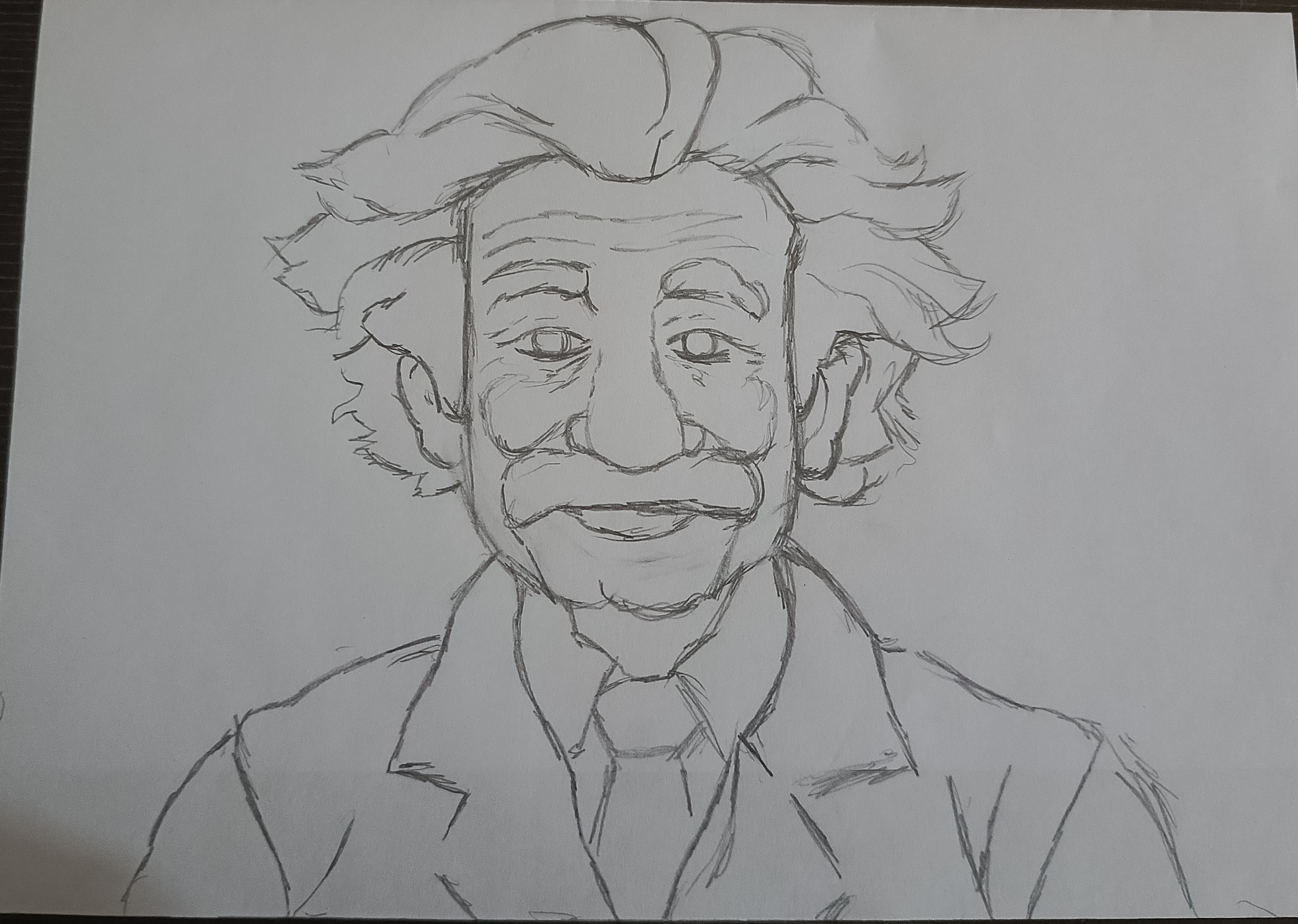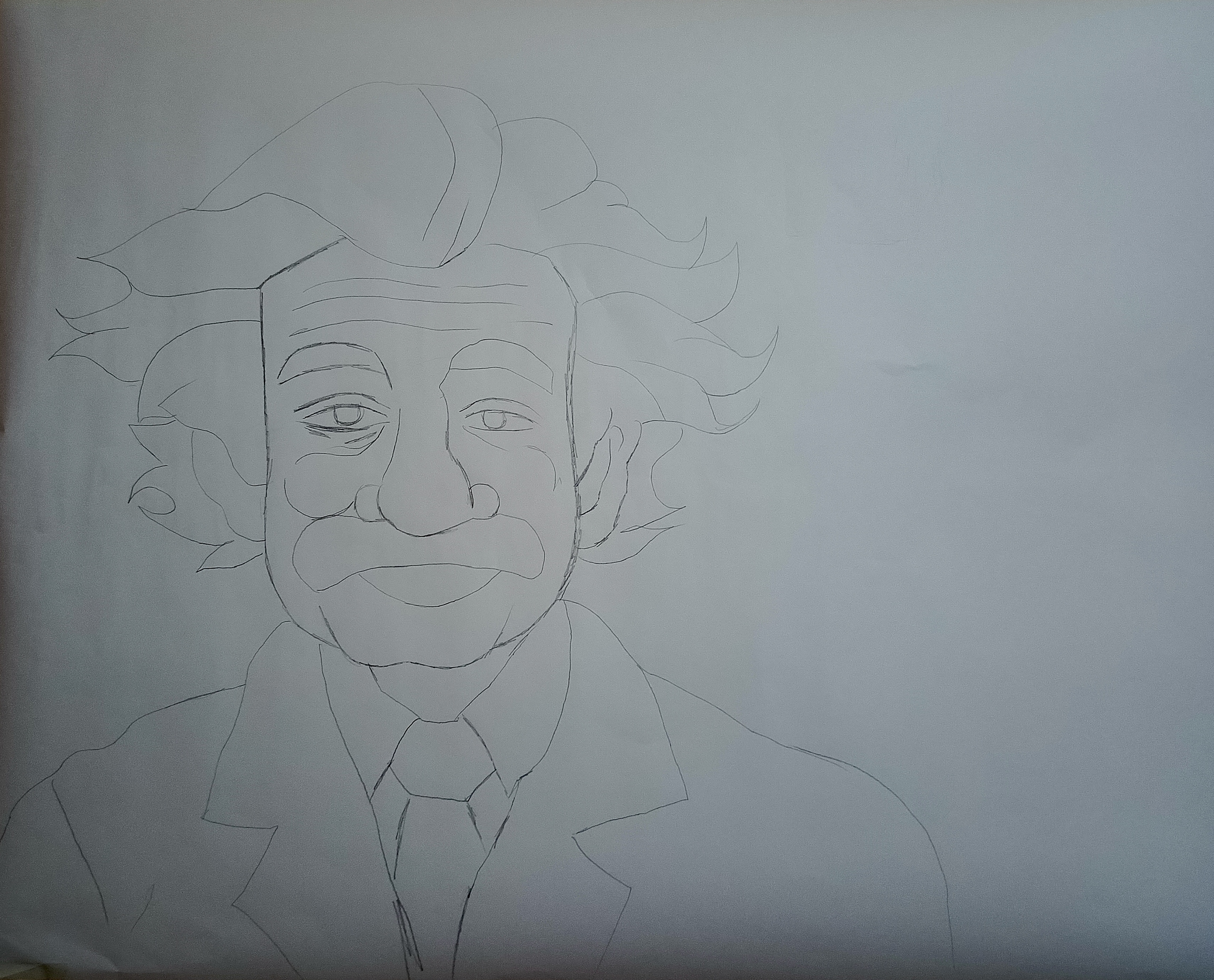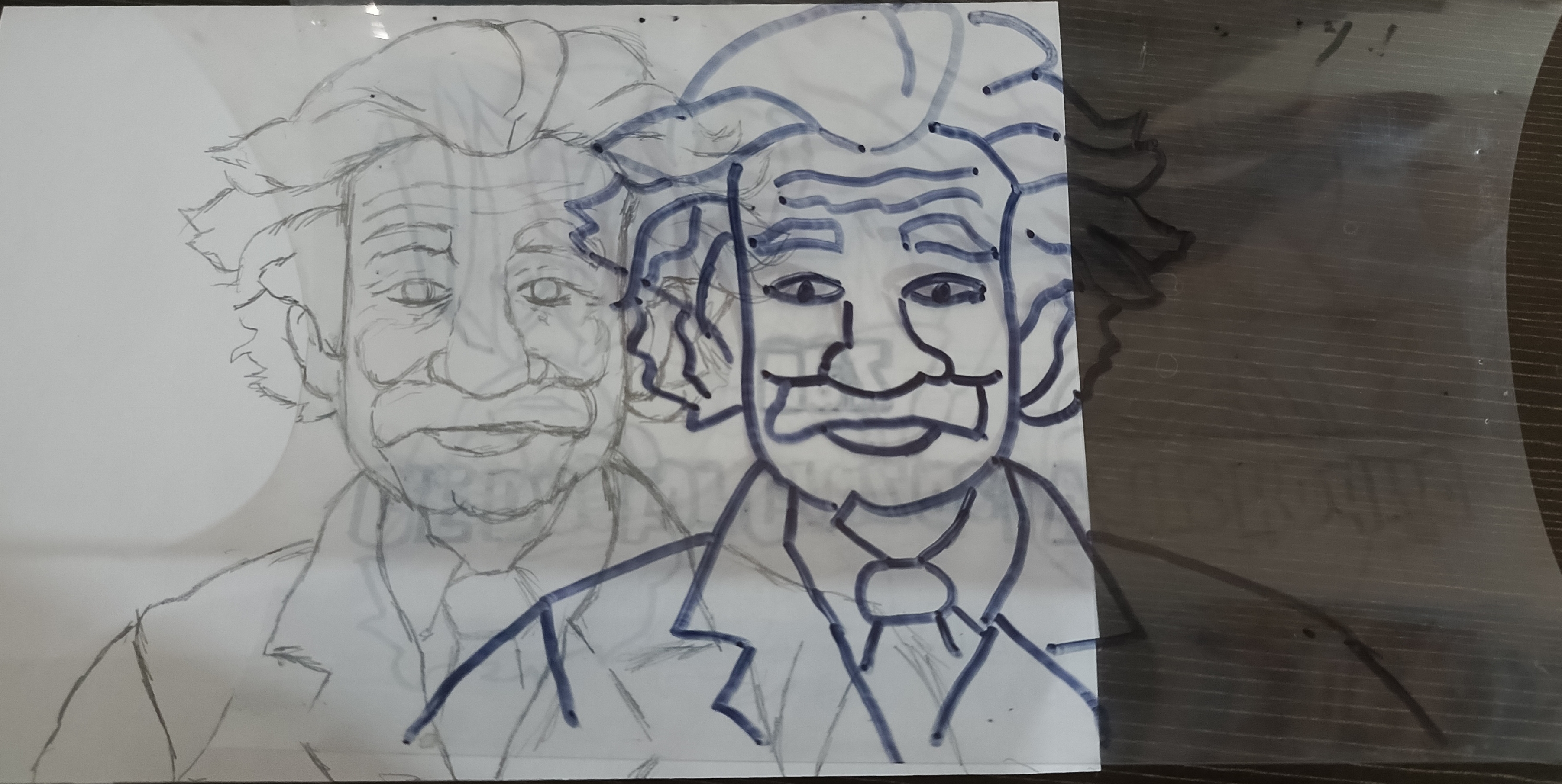 Primero dibuje a mano alzada el rostro de Albert Einstein, cuando ya estaba listo coloque la hoja de acetato sobre la hoja del boceto y lo marque transfiriendo la imagen al acetato, también se puede dibujar directo en el acetato pero me gusta hacerlo primero en el papel porque si me equivoco es más fácil borrarlo.