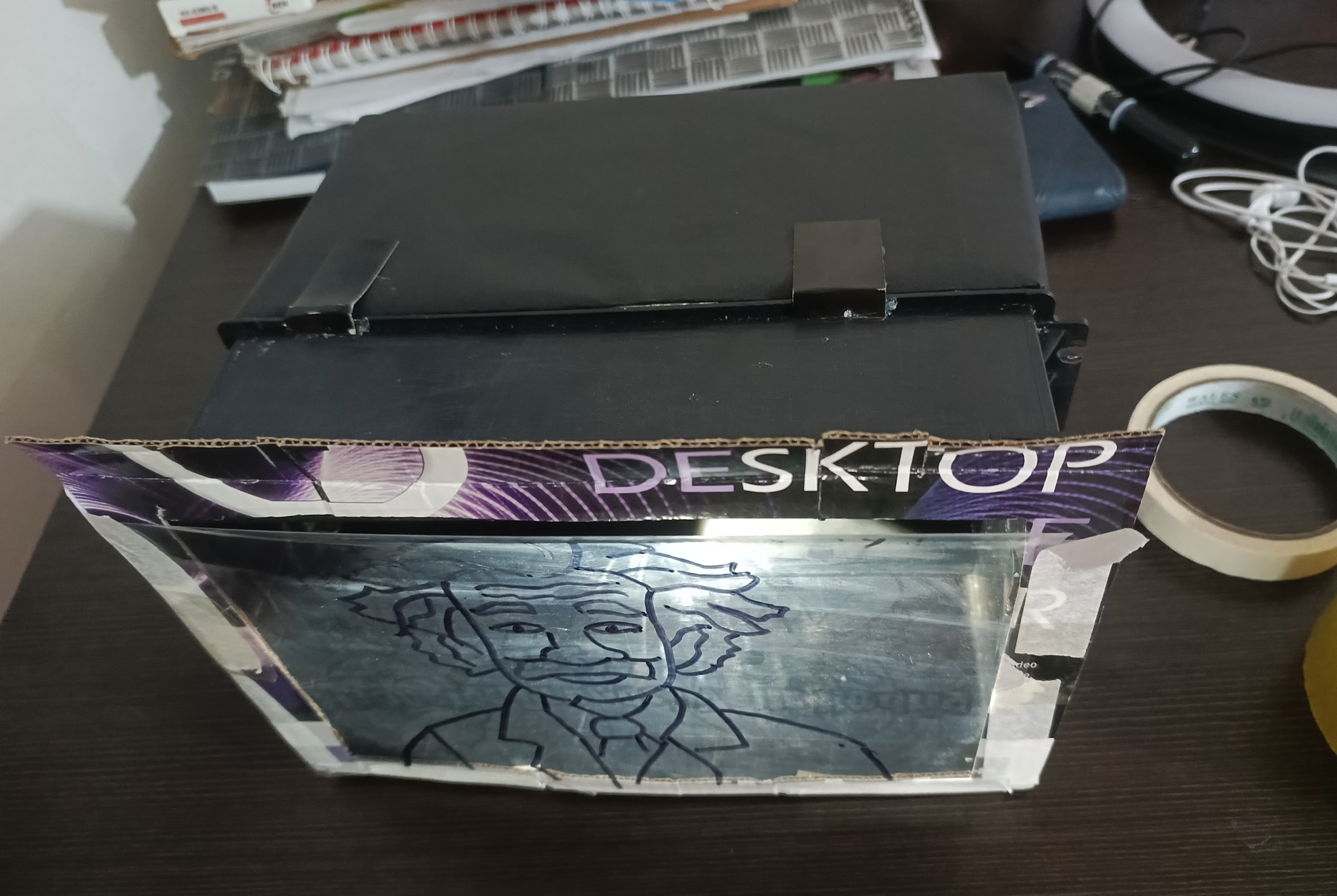 Luego lo coloque en el proyector casero que hice con la ayuda de mi mamá y alumbrando con la linterna del teléfono por la parte de atrás se proyecto sobre la cartulina que tenía pegada en la pared.