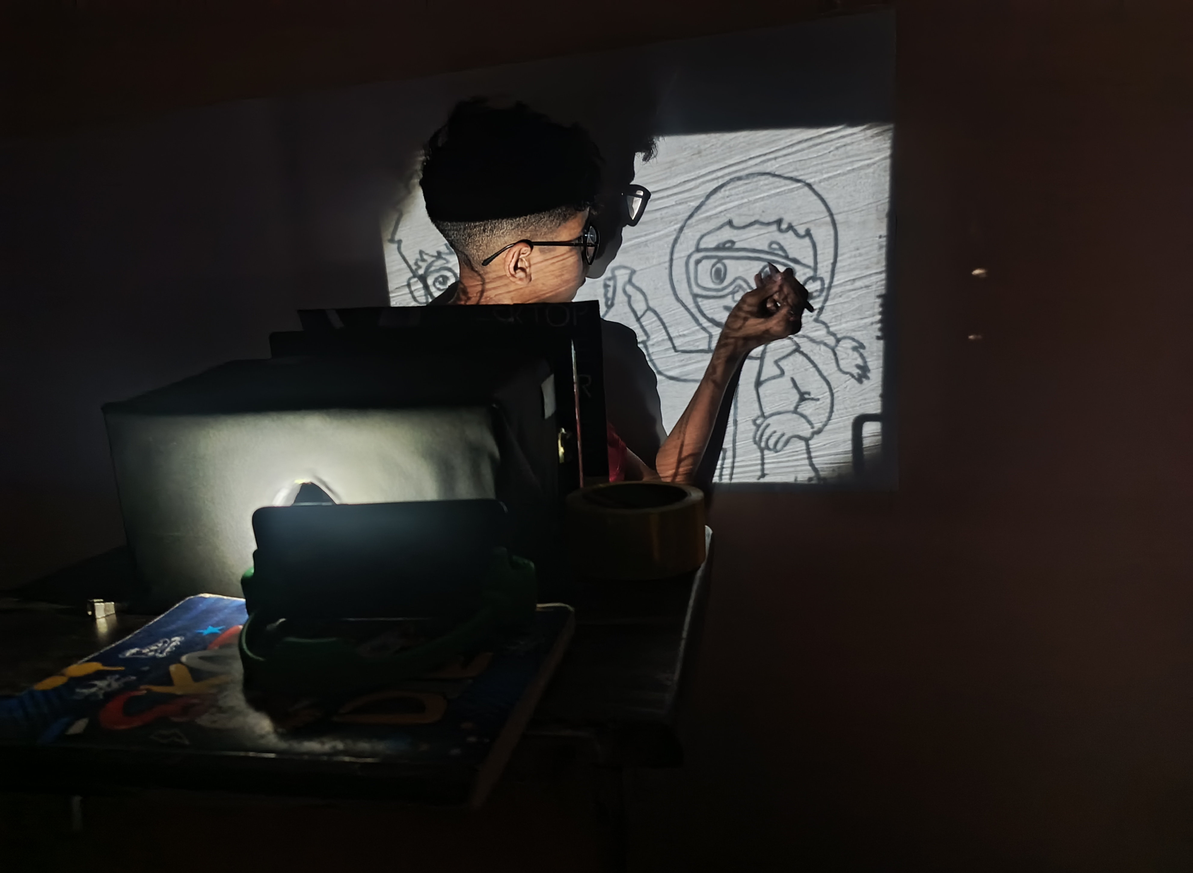 Aquí con la luz de la linterna ajusté el tamaño que quería y comencé a dibujarlo en la cartulina, es una manera más fácil de hacer dibujos a grandes escalas.