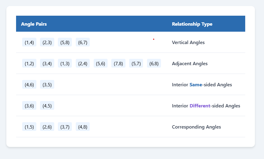 When constructing lines intersected by a transversal, we can identify several angle pairs: