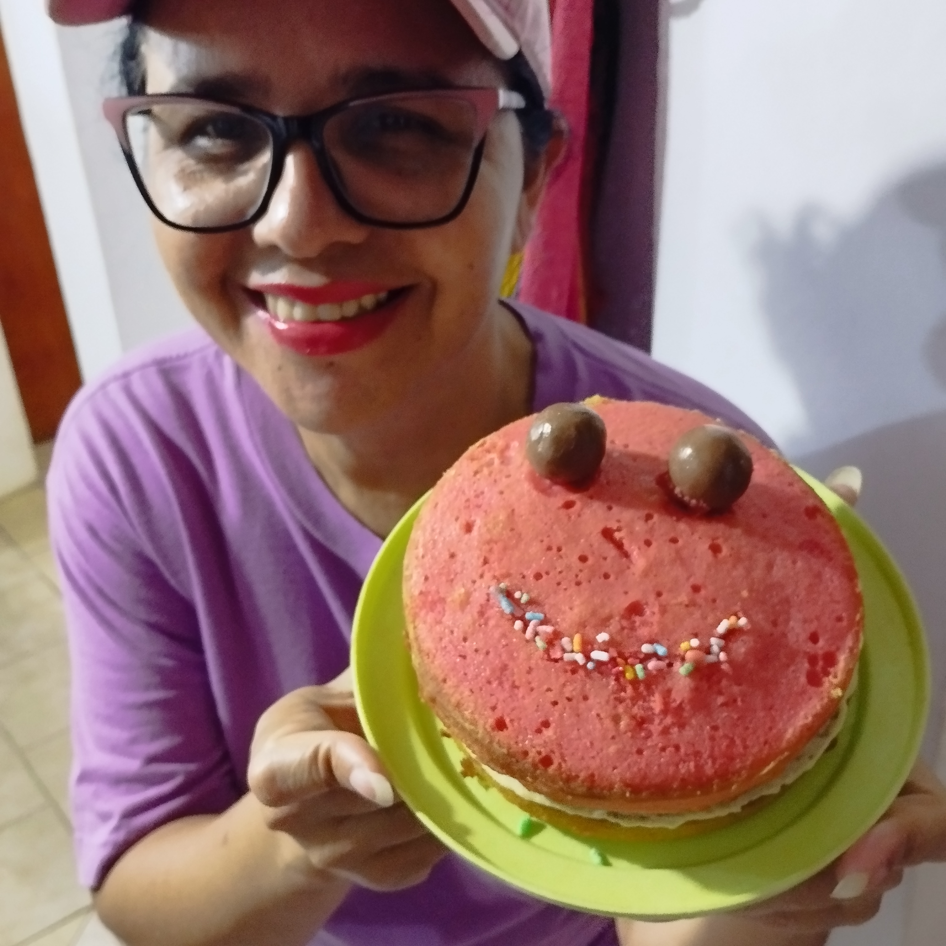 Al final decoré con lo que tenía en casa, dado que el colorante le añadió lindos colores, no tenía caso opacarlos, así que sololes coloqué 2 bolitas de chocolate para simbolizar unos ojitosy chispitas de colores para dra forma a una boquita dulcera. Me siento muy contenta de tener la oportunidad de aprender sobre resposteria, esta receta es novedosa para mi.