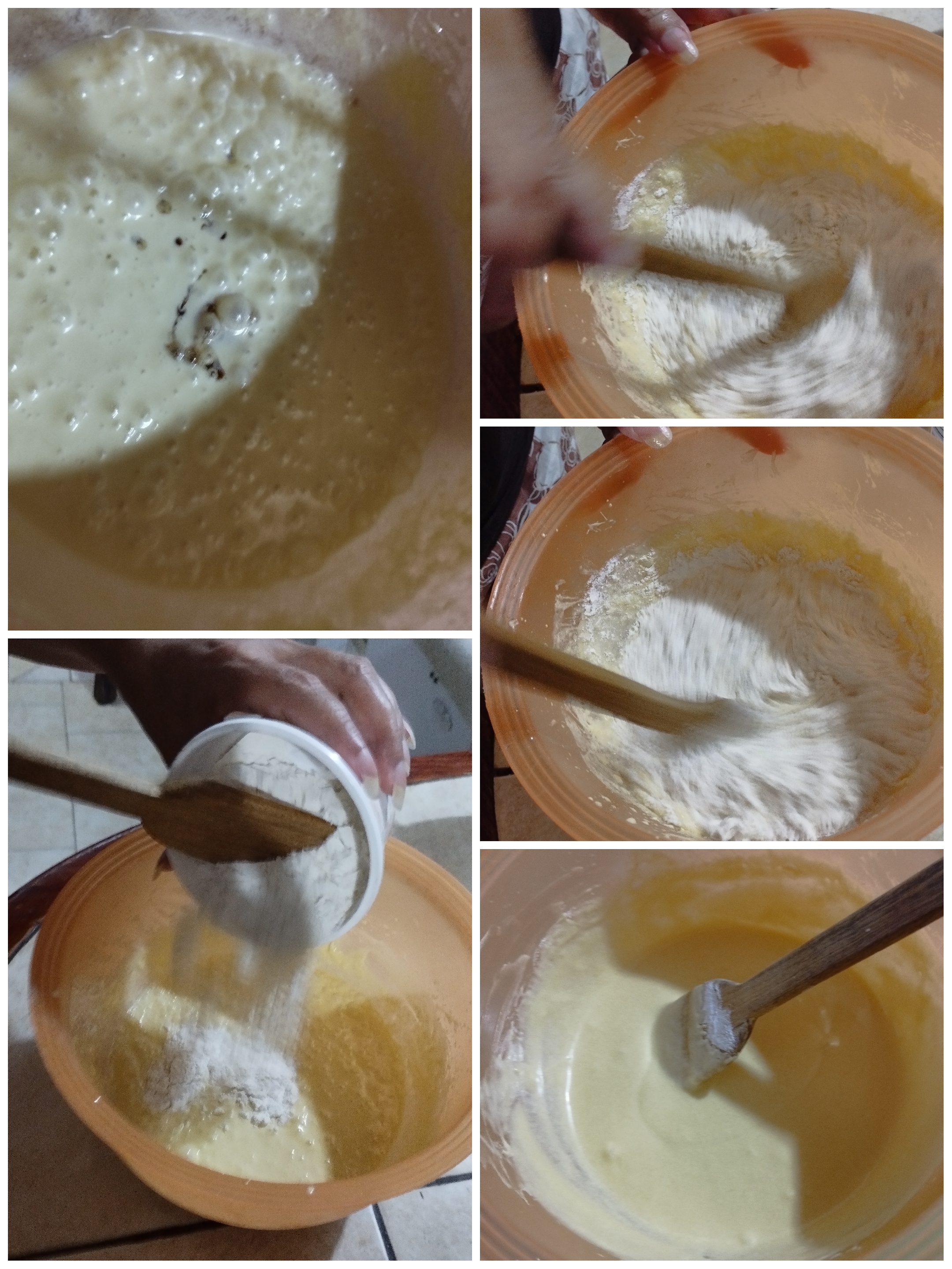 En este paso añadiremos 3 ingredientes, primero la cucharadita de vainilla permiriendo así un cambio en el color de la mezcla y un rico olor; seguidamente añadiremos polvo de hornear previamente cernido, de igual manera la harina; mezclamos todo, en este paso usaremos la paleta de madera.